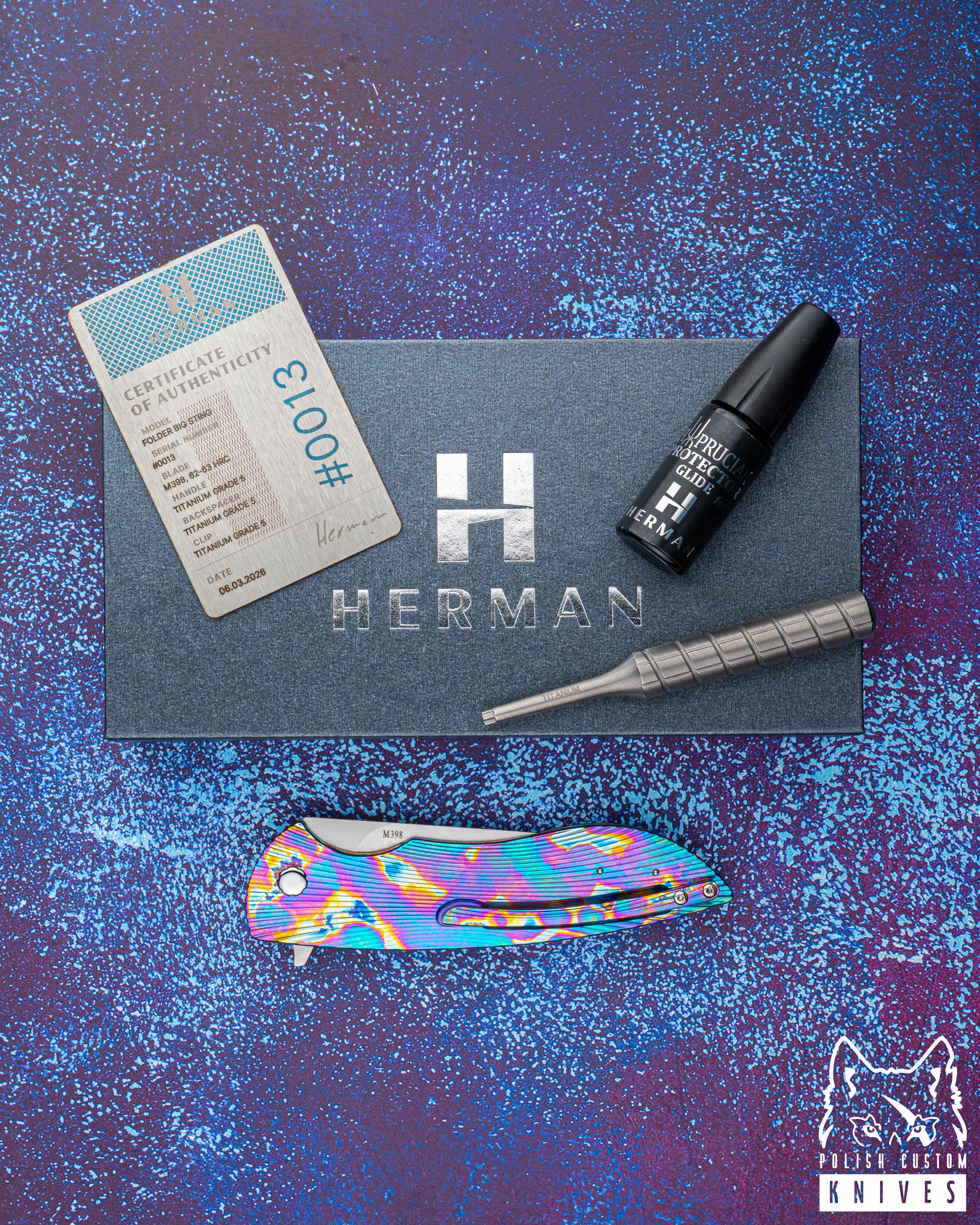 New original box including a microfiber cloth, Pruciak Protector Glide for Herman oil, and a dedicated titanium screwdriver manufactured in-house by Herman Knives.