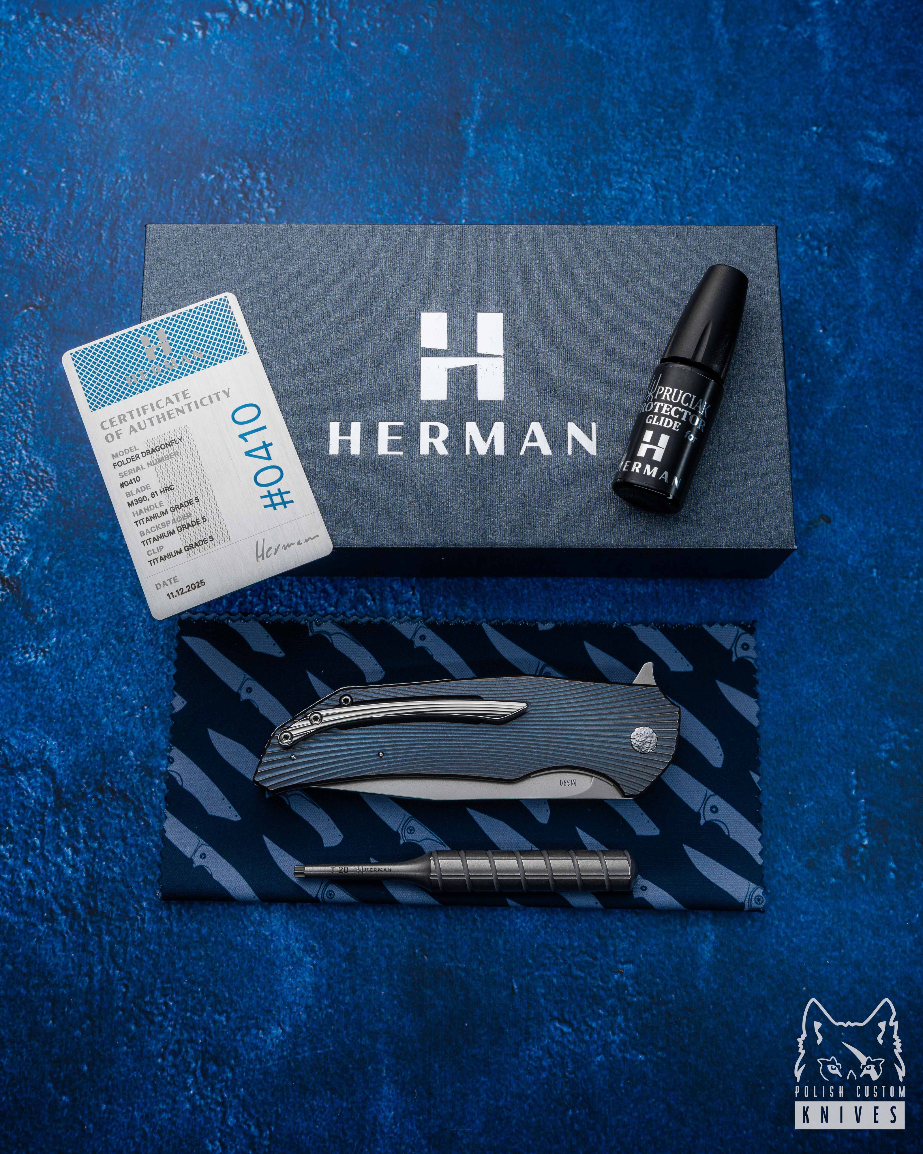 New original box including a microfiber cloth, Pruciak Protector Glide for Herman oil, and a dedicated titanium screwdriver manufactured in-house by Herman Knives.