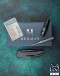 New original box including a microfiber cloth, Pruciak Protector Glide for Herman oil, and a dedicated titanium screwdriver manufactured in-house by Herman Knives.