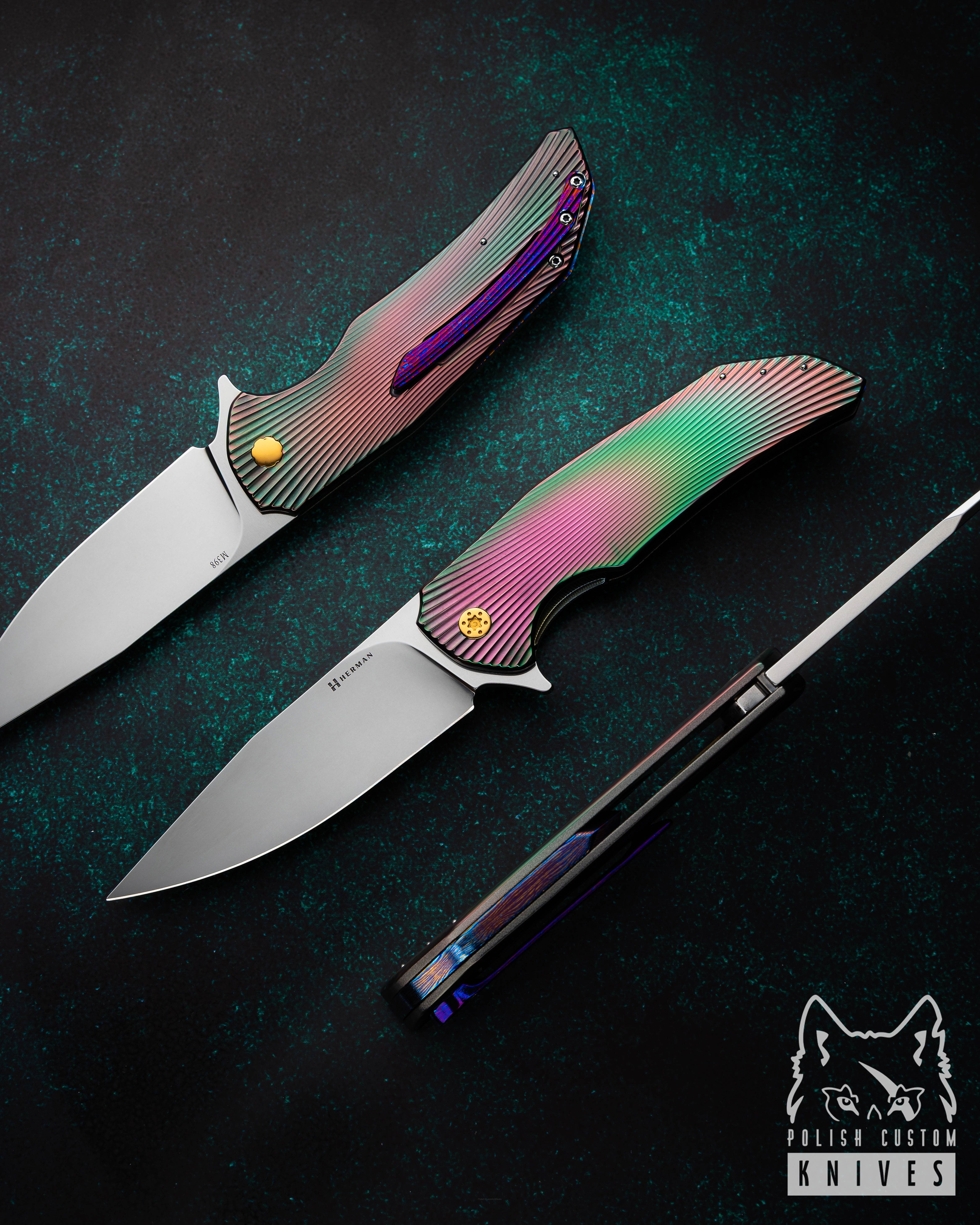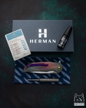 New original box including a microfiber cloth, Pruciak Protector Glide for Herman oil, and a dedicated titanium screwdriver manufactured in-house by Herman Knives.