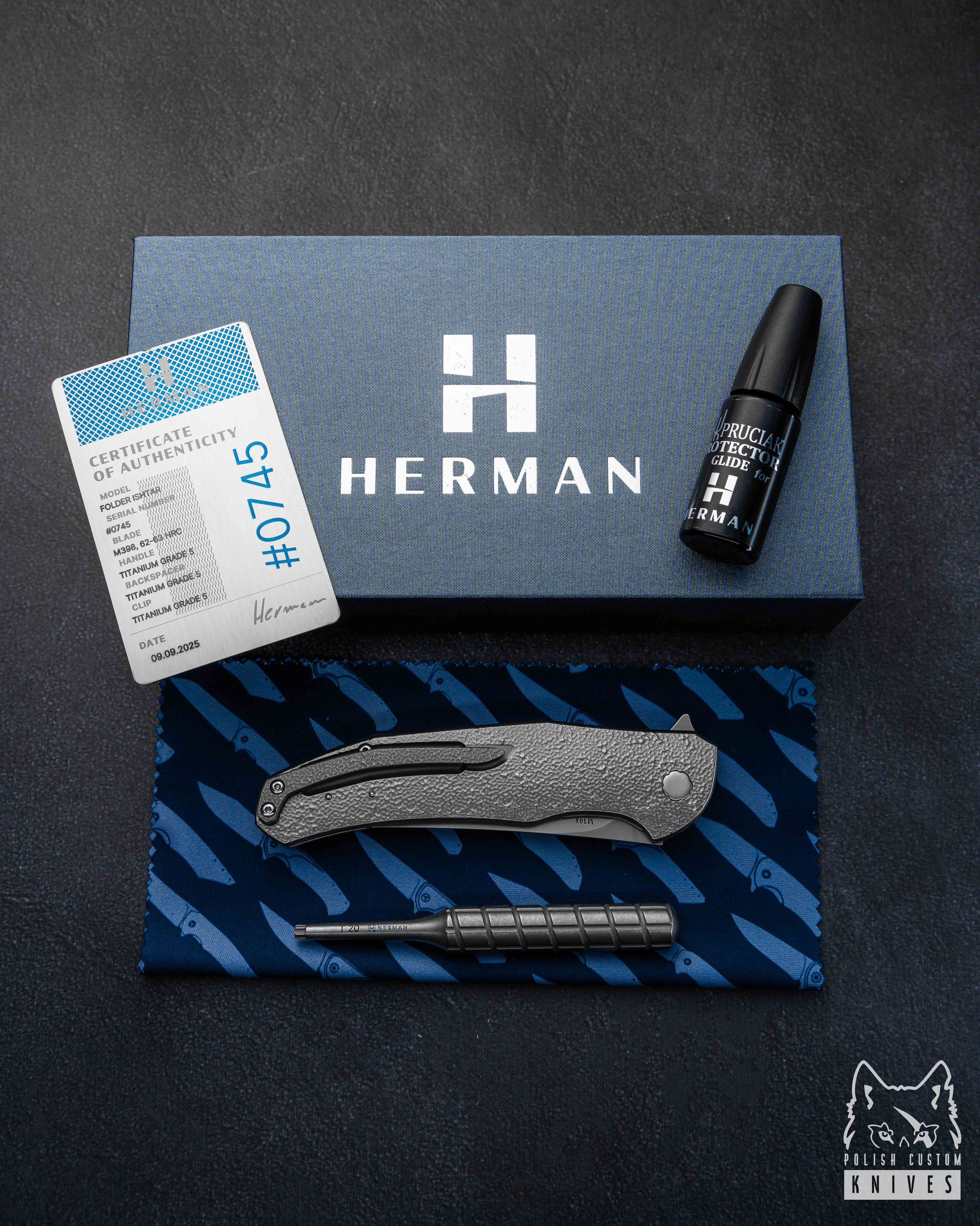 New original box including a microfiber cloth, Pruciak Protector Glide for Herman oil, and a dedicated titanium screwdriver manufactured in-house by Herman Knives.