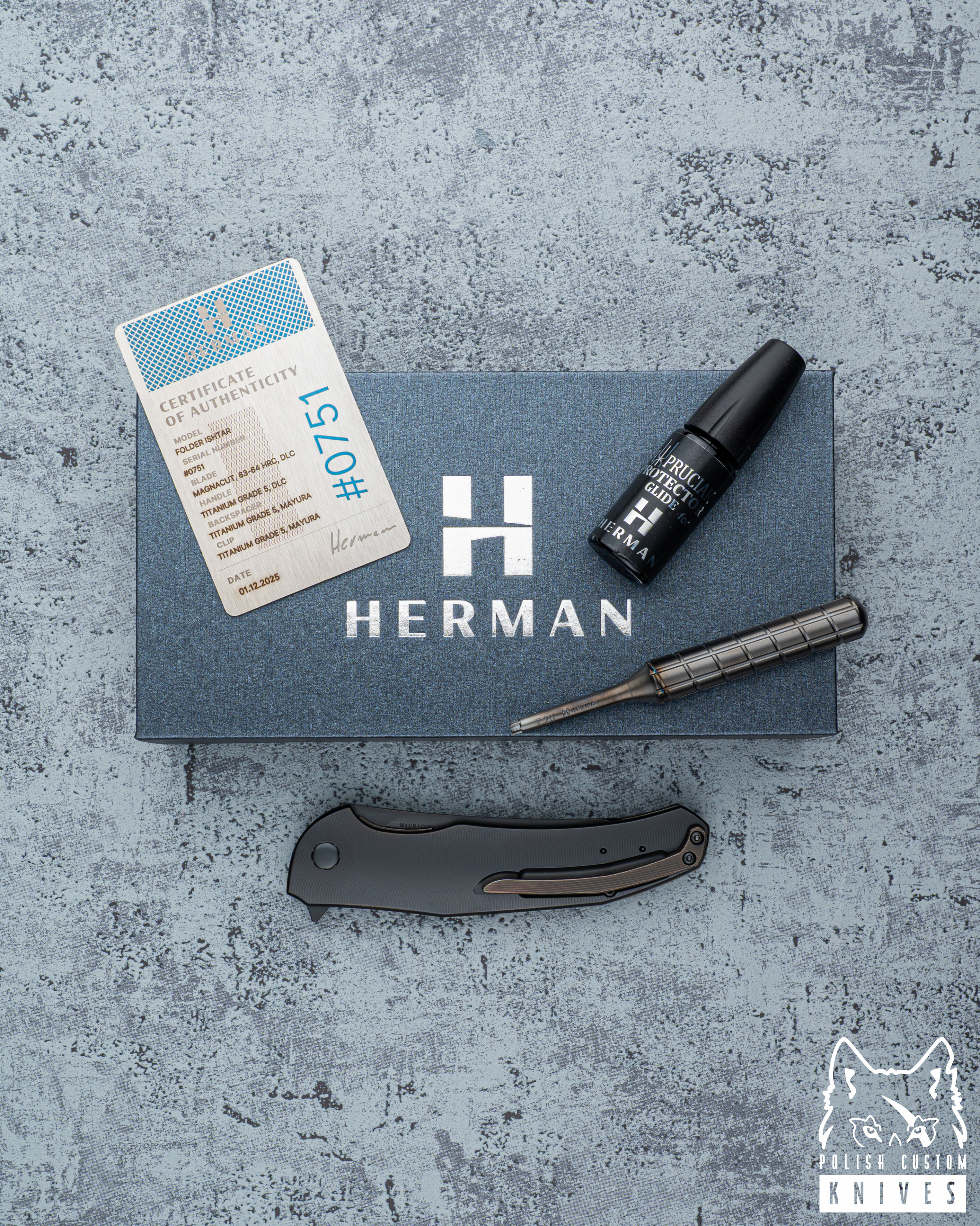 New original box including a microfiber cloth, Pruciak Protector Glide for Herman oil, and a dedicated titanium screwdriver manufactured in-house by Herman Knives.