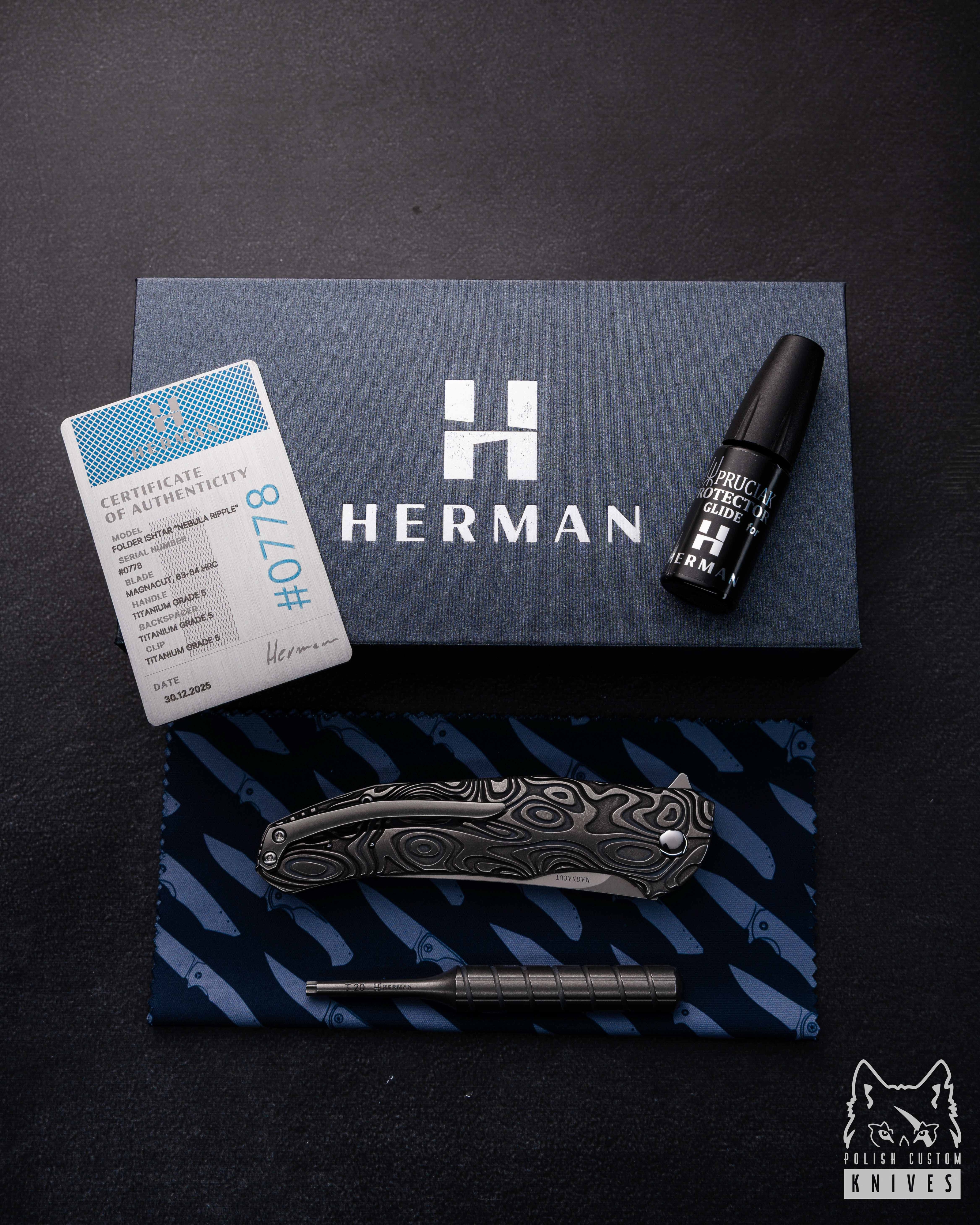 New original box including a microfiber cloth, Pruciak Protector Glide for Herman oil, and a dedicated titanium screwdriver manufactured in-house by Herman Knives.