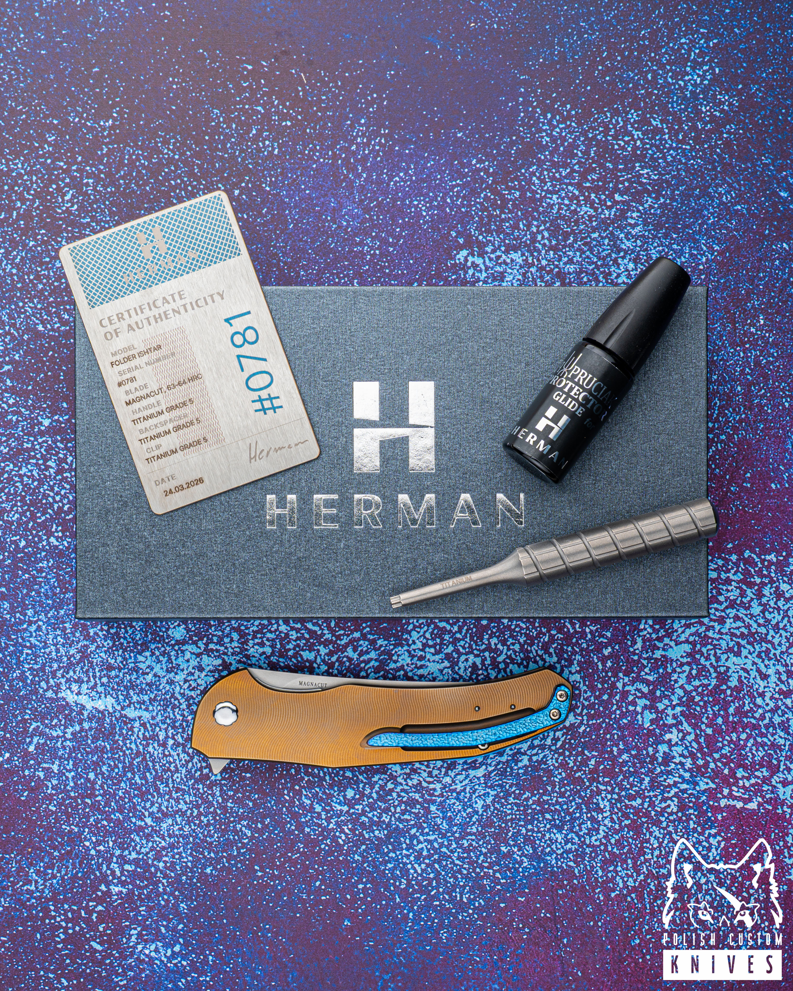 New original box including a microfiber cloth, Pruciak Protector Glide for Herman oil, and a dedicated titanium screwdriver manufactured in-house by Herman Knives.