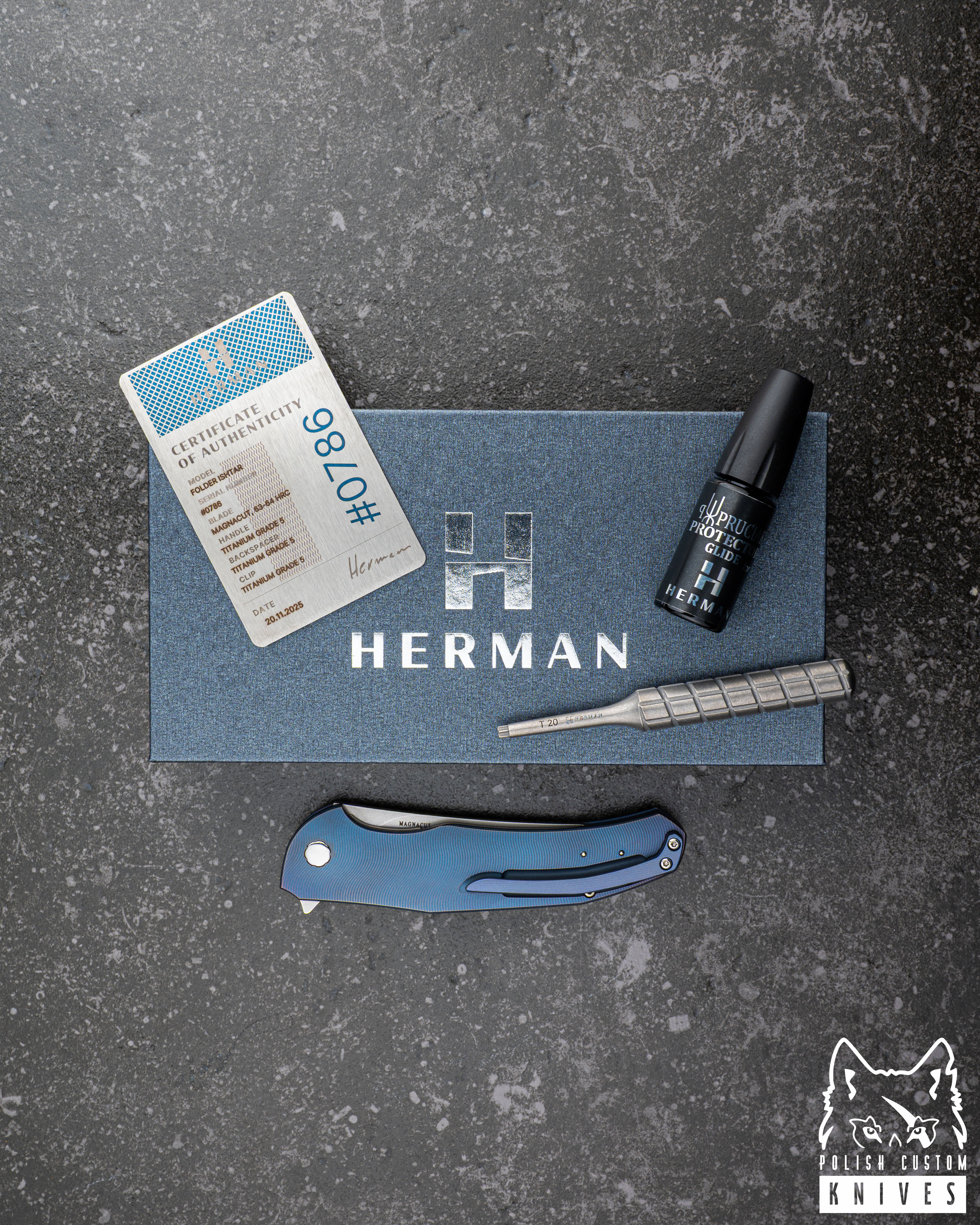 New original box including a microfiber cloth, Pruciak Protector Glide for Herman oil, and a dedicated titanium screwdriver manufactured in-house by Herman Knives.