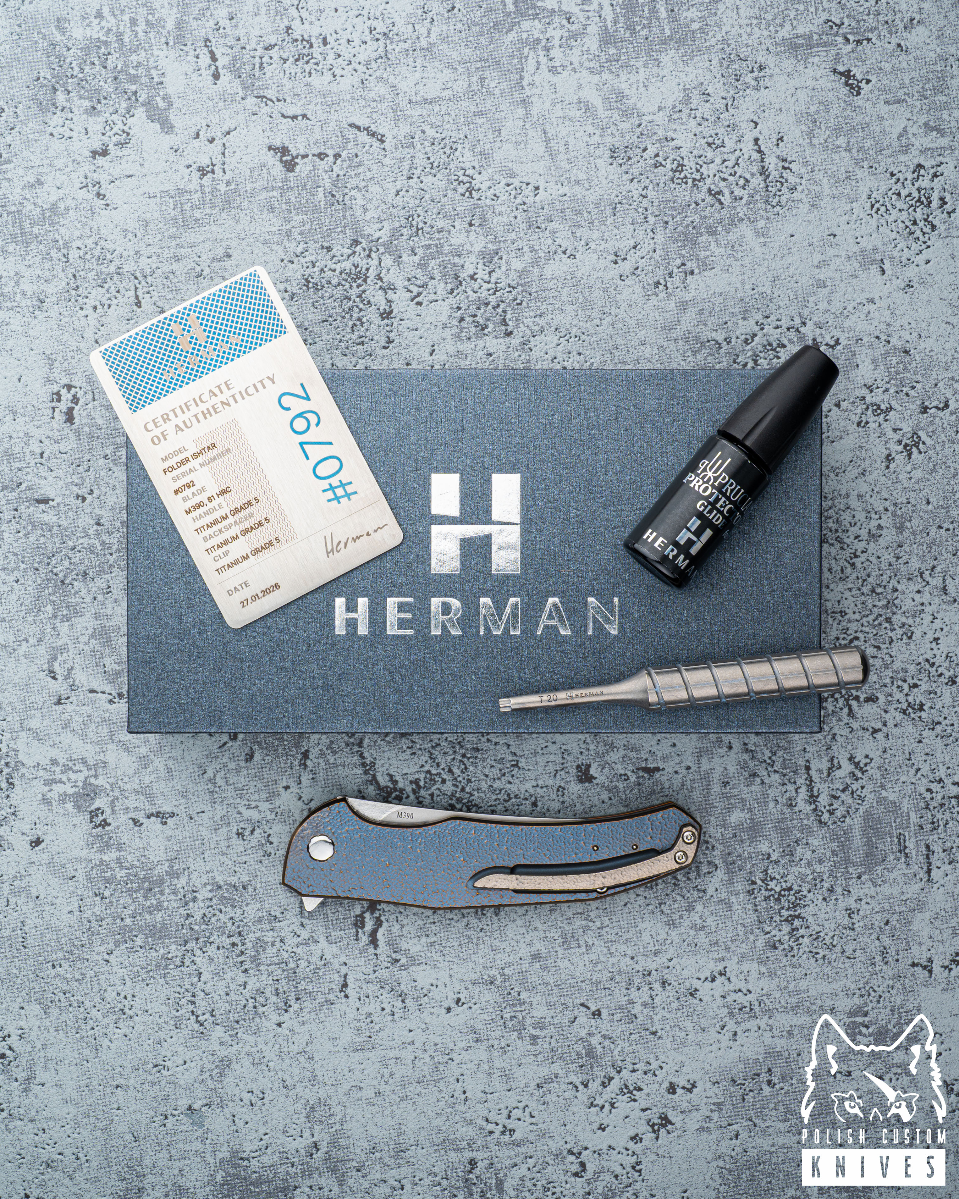 New original box including a microfiber cloth, Pruciak Protector Glide for Herman oil, and a dedicated stainless steel screwdriver manufactured in-house by Herman Knives.