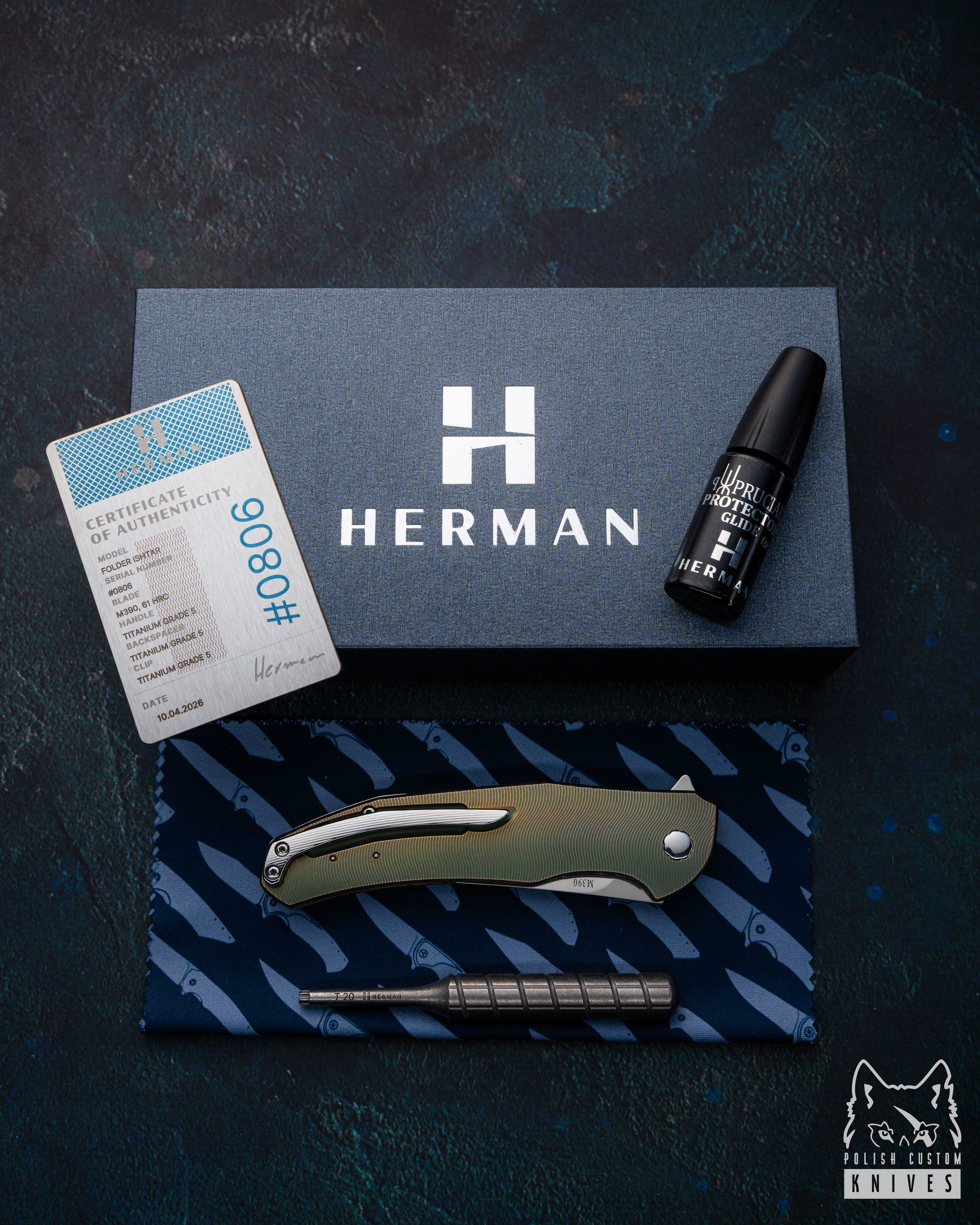 New original box including a microfiber cloth, Pruciak Protector Glide for Herman oil, and a dedicated titanium screwdriver manufactured in-house by Herman Knives.