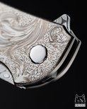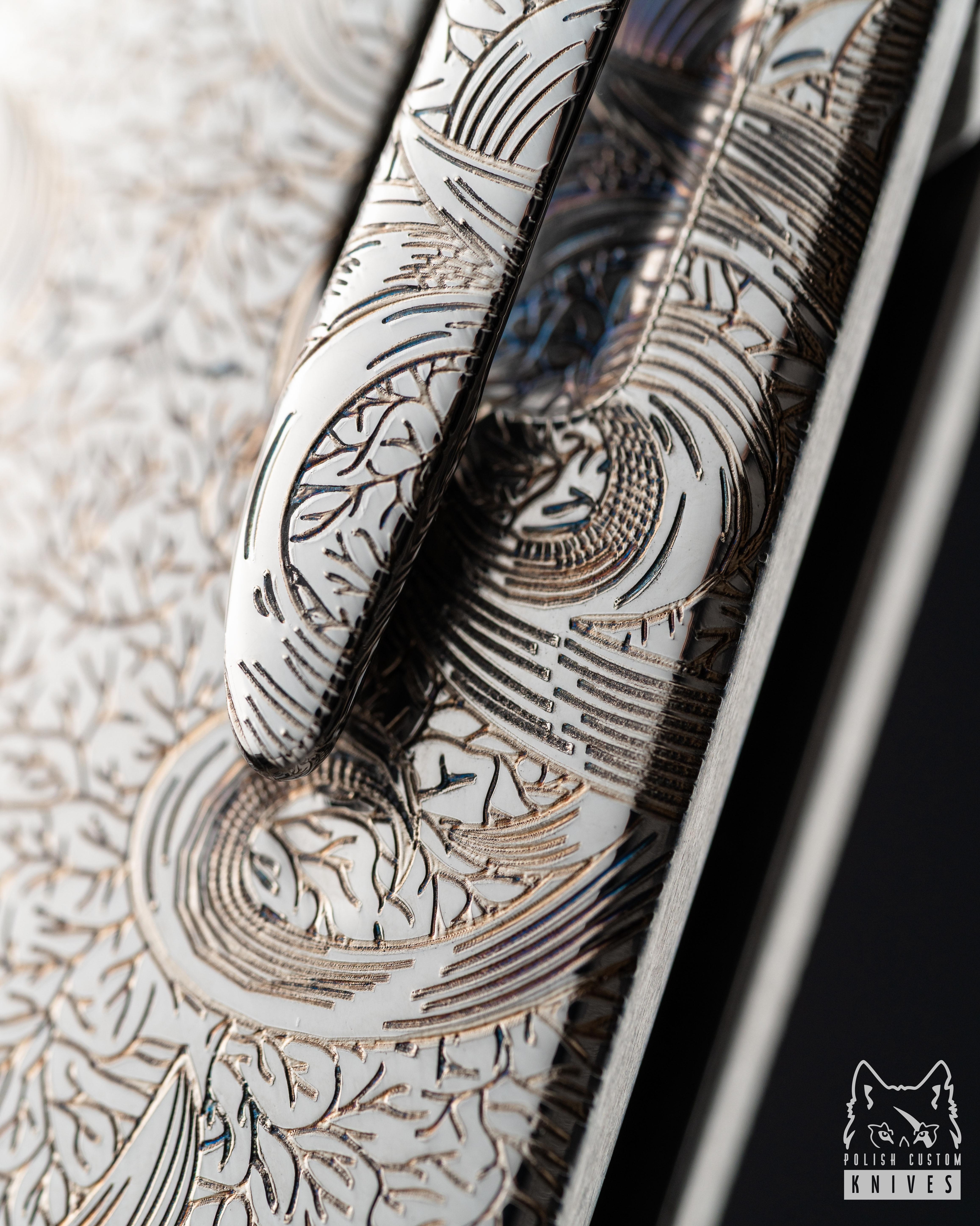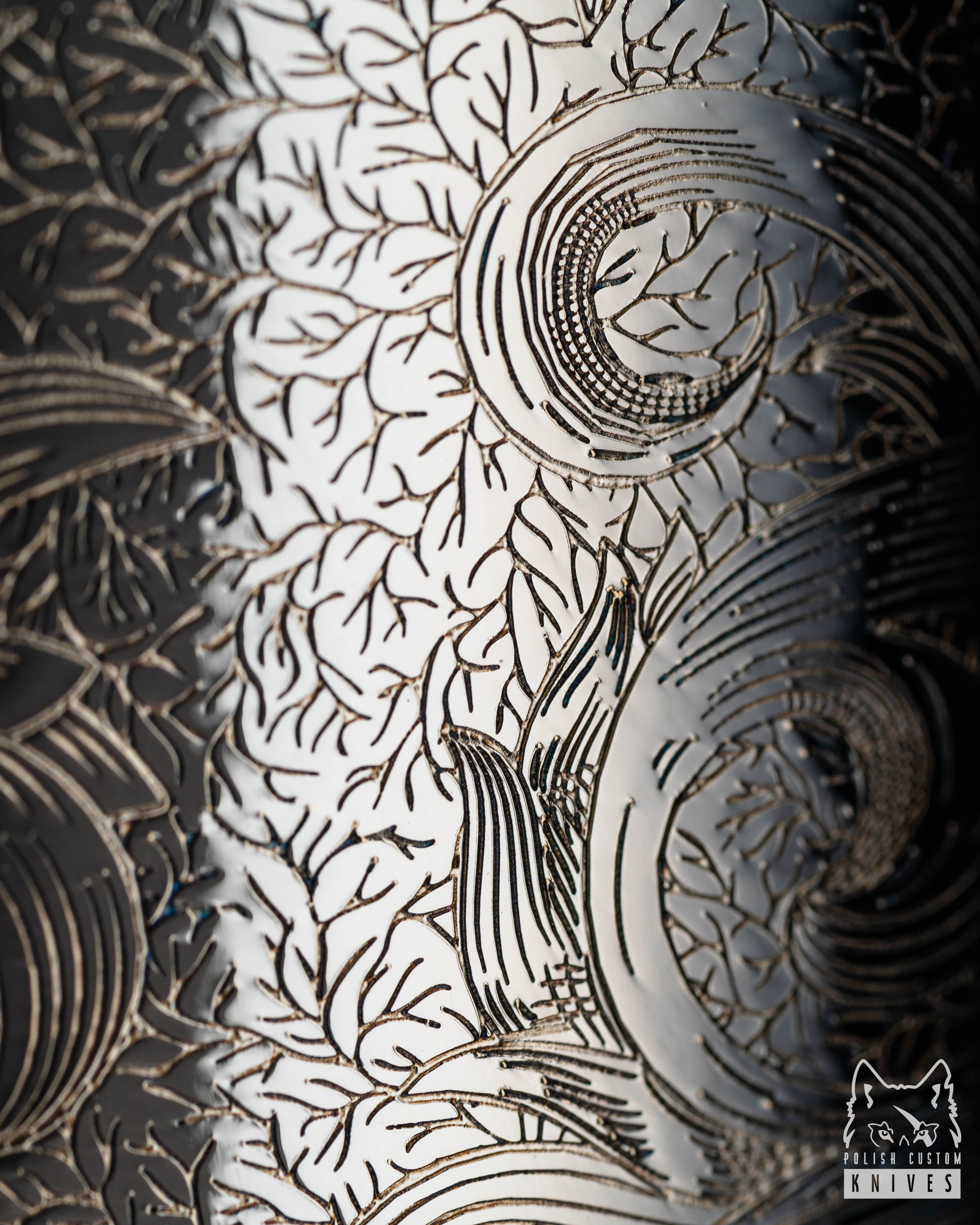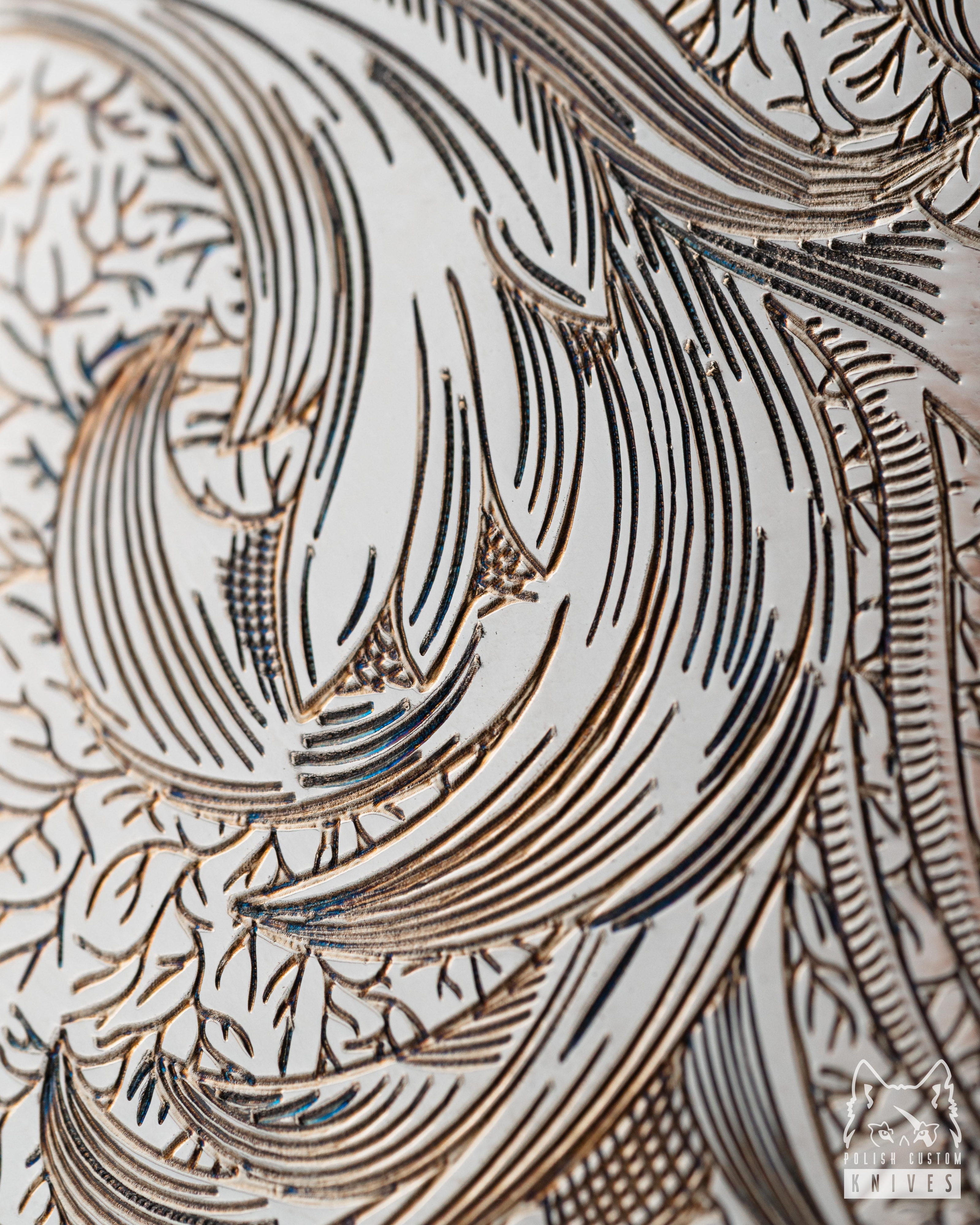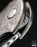 The pattern invites a moment of stillness and contemplation – every line carries a rhythm, and every curve symbolizes the immortal, ever-renewing nature that has adorned the world’s finest weapons since antiquity in the form of the acanthus leaf. Designer Julia Jasiczak has infused this project with a jeweler’s attention to detail, giving the engraving an authentic, artisanal feel. The pattern plays subtly with light, lending the blade depth and an intriguing character.
