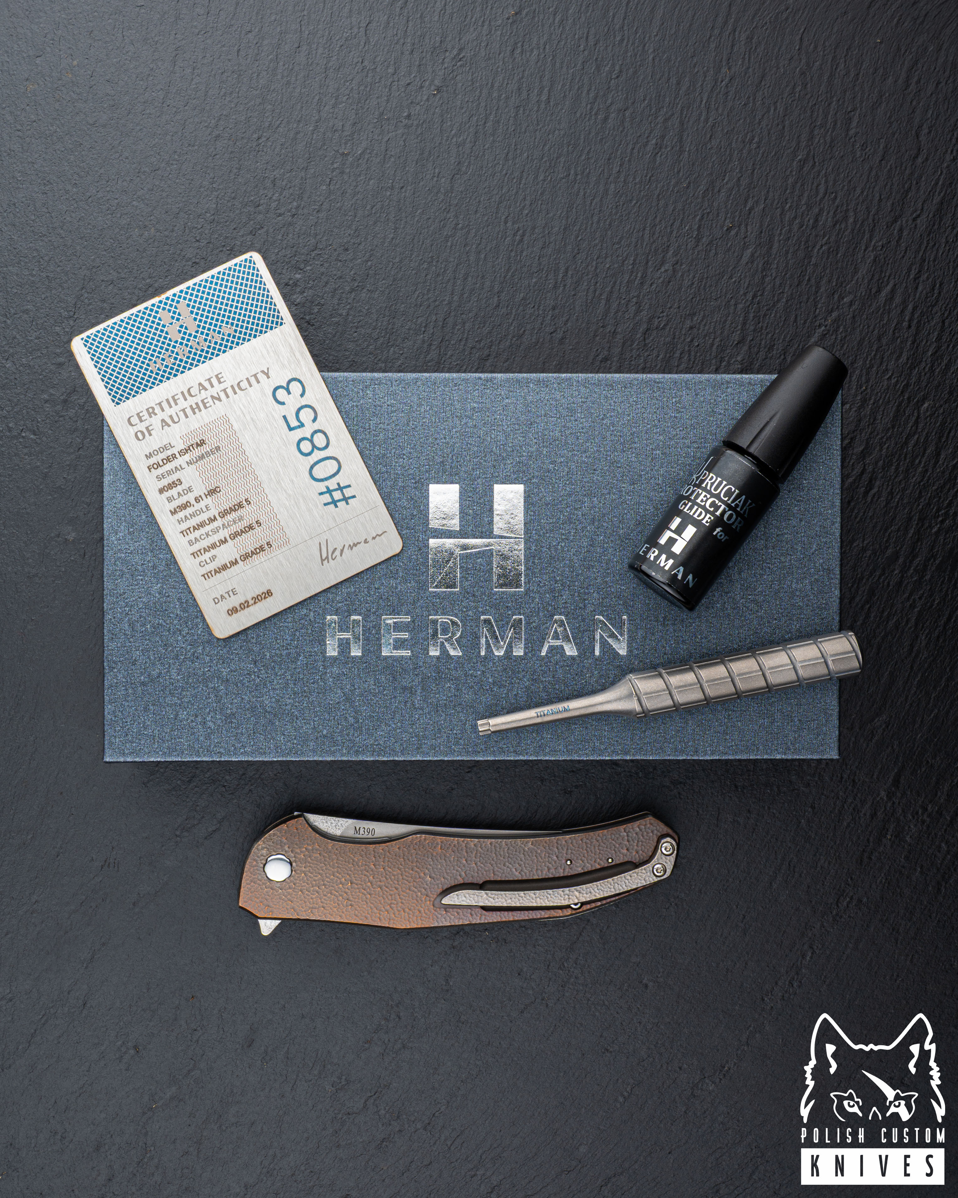 New original box including a microfiber cloth, Pruciak Protector Glide for Herman oil, and a dedicated stainless steel screwdriver manufactured in-house by Herman Knives.