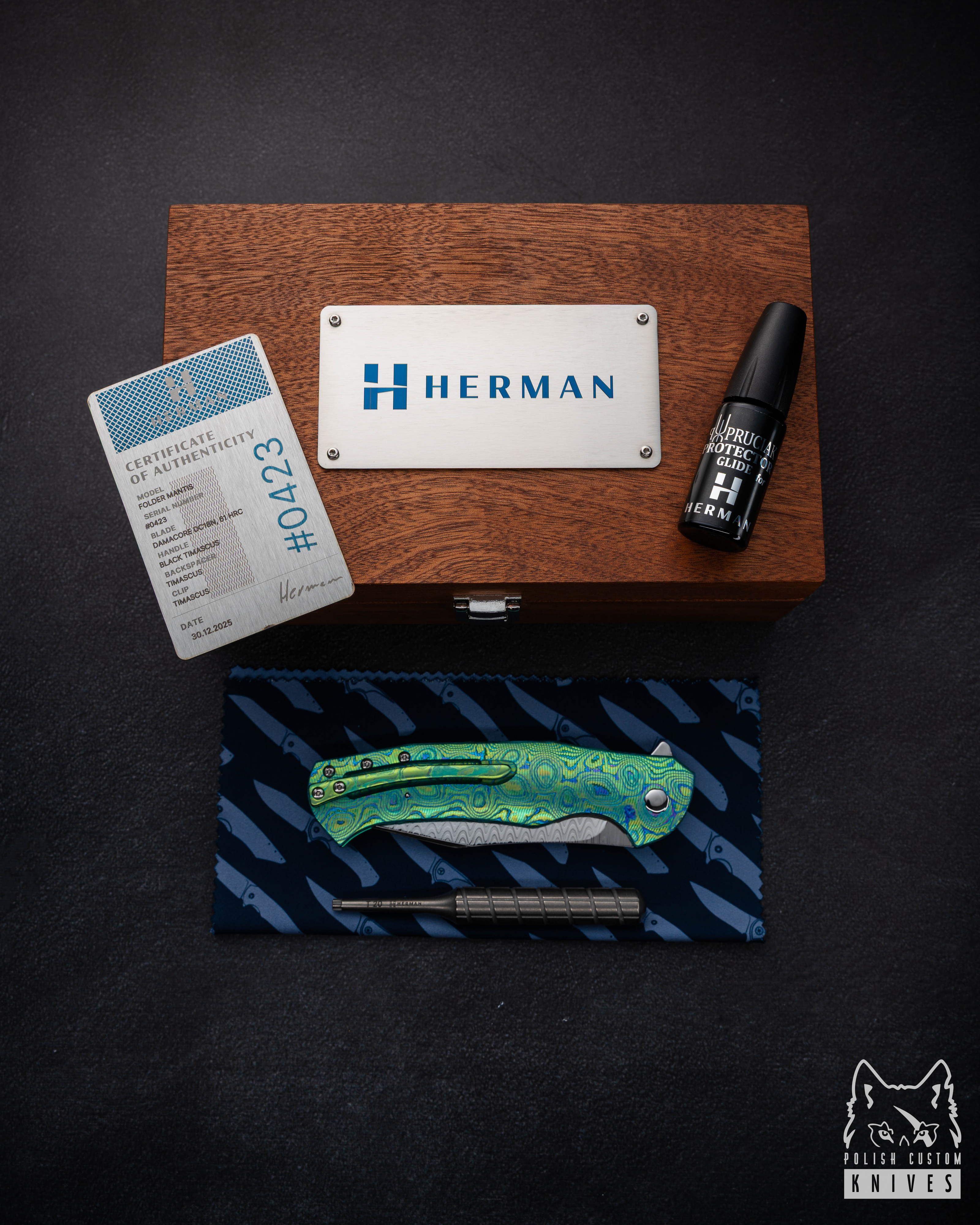 New original wooden box including a microfiber cloth, Pruciak Protector Glide for Herman oil, and a dedicated titanium screwdriver manufactured in-house by Herman Knives.