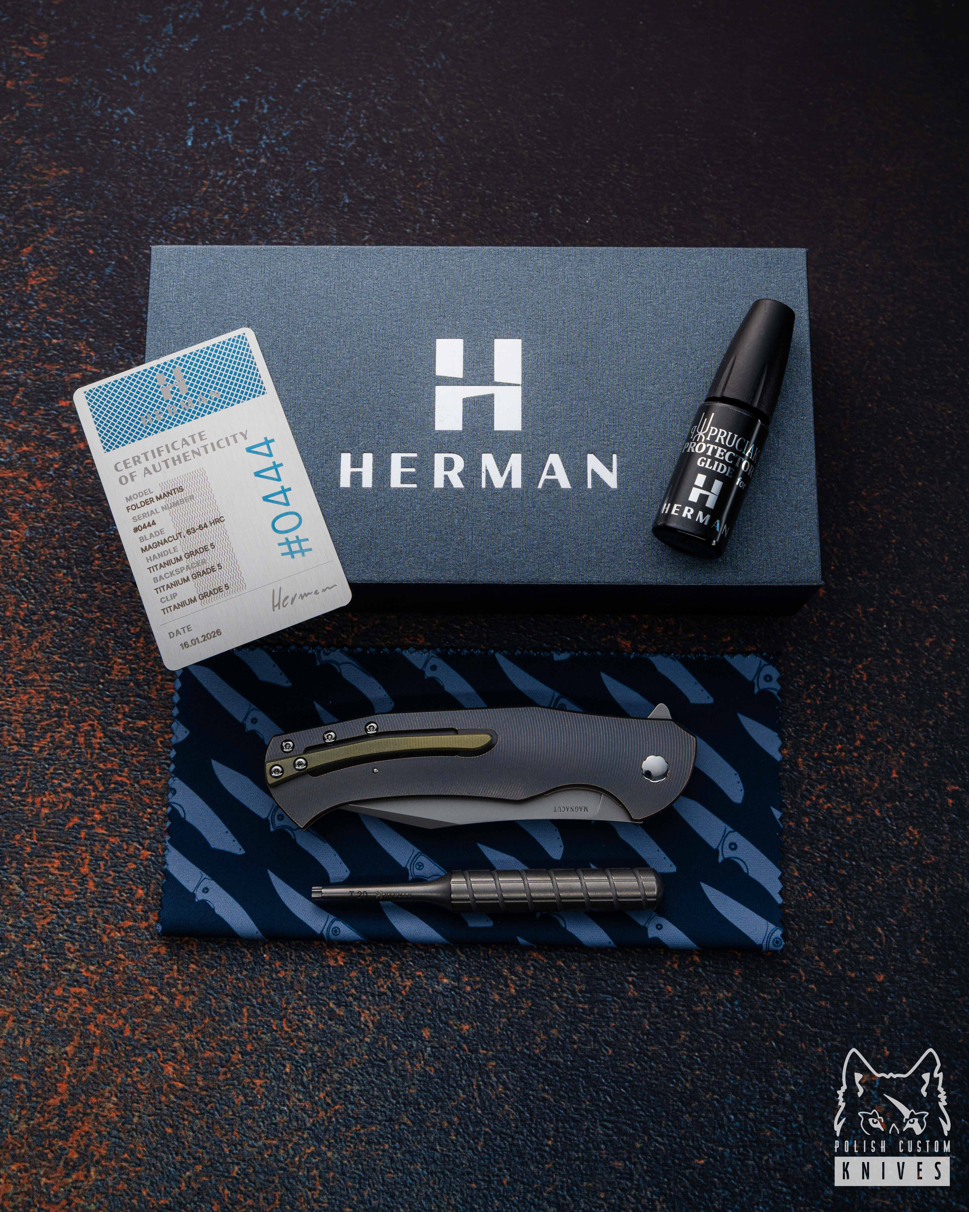 New original box including a microfiber cloth, Pruciak Protector Glide for Herman oil, and a dedicated titanium screwdriver manufactured in-house by Herman Knives.