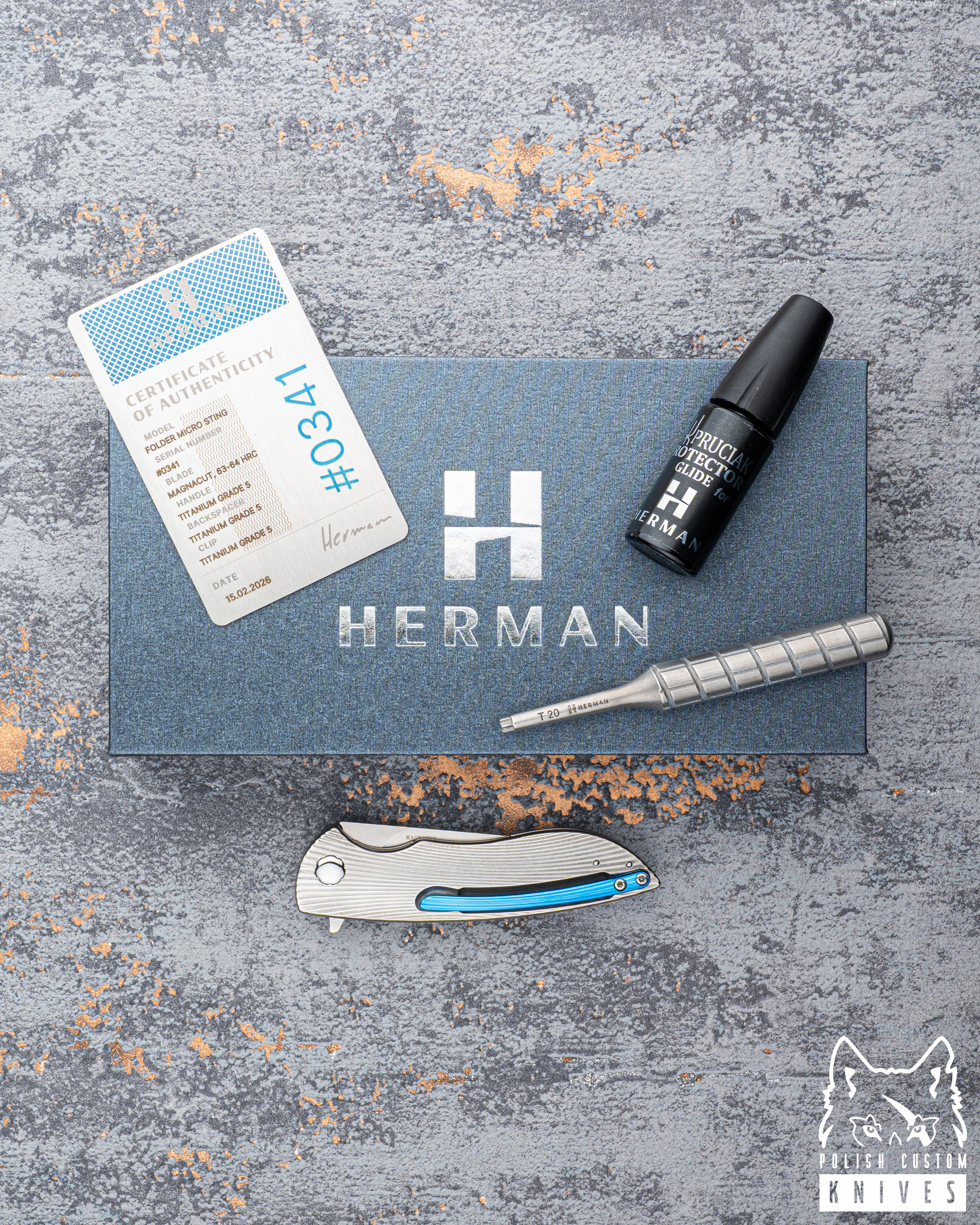 New original box including a microfiber cloth, Pruciak Protector Glide for Herman oil, and a dedicated stainless steel screwdriver manufactured in-house by Herman Knives.