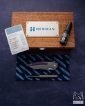 New original wooden box including a microfiber cloth, Pruciak Protector Glide for Herman oil, and a dedicated titanium screwdriver manufactured in-house by Herman Knives.