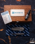 New original wooden box including a microfiber cloth, Pruciak Protector Glide for Herman oil, and a dedicated titanium screwdriver manufactured in-house by Herman Knives.