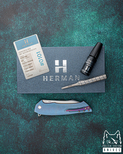 New original box including a microfiber cloth, Pruciak Protector Glide for Herman oil, and a dedicated stainless steel screwdriver manufactured in-house by Herman Knives.