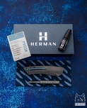 New original box including a microfiber cloth, Pruciak Protector Glide for Herman oil, and a dedicated titanium screwdriver manufactured in-house by Herman Knives.
