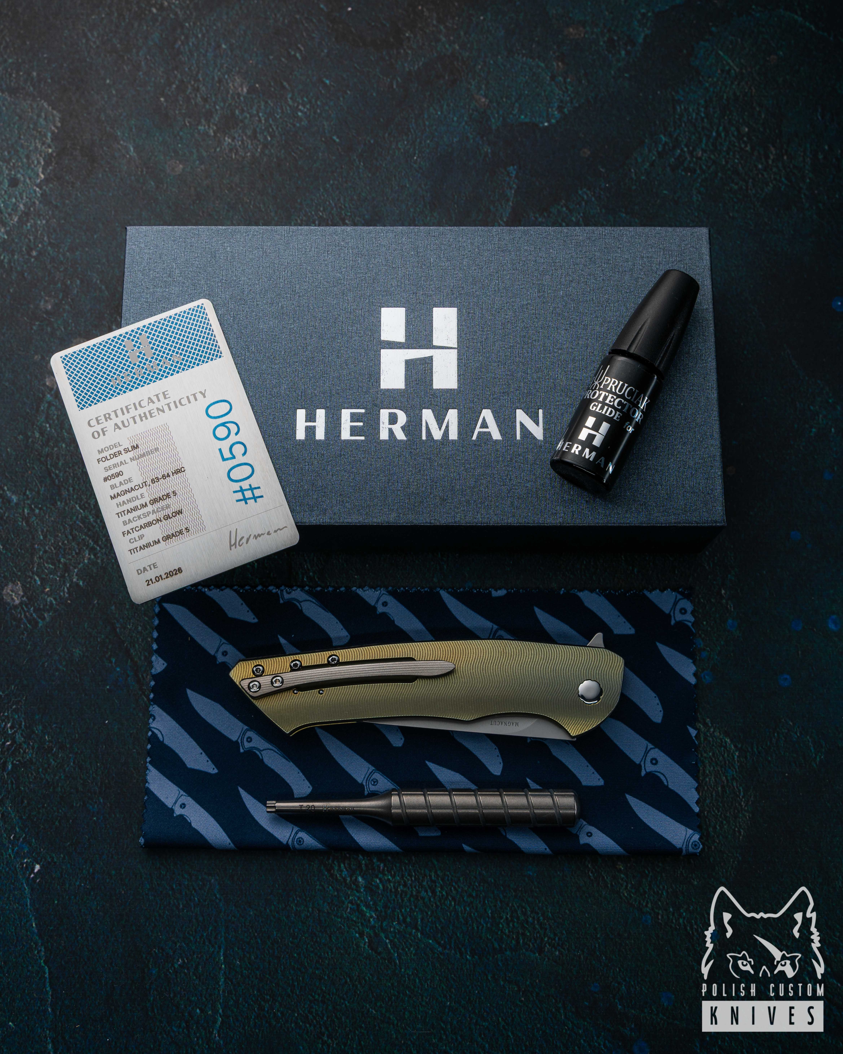 New original box including a microfiber cloth, Pruciak Protector Glide for Herman oil, and a dedicated titanium screwdriver manufactured in-house by Herman Knives.