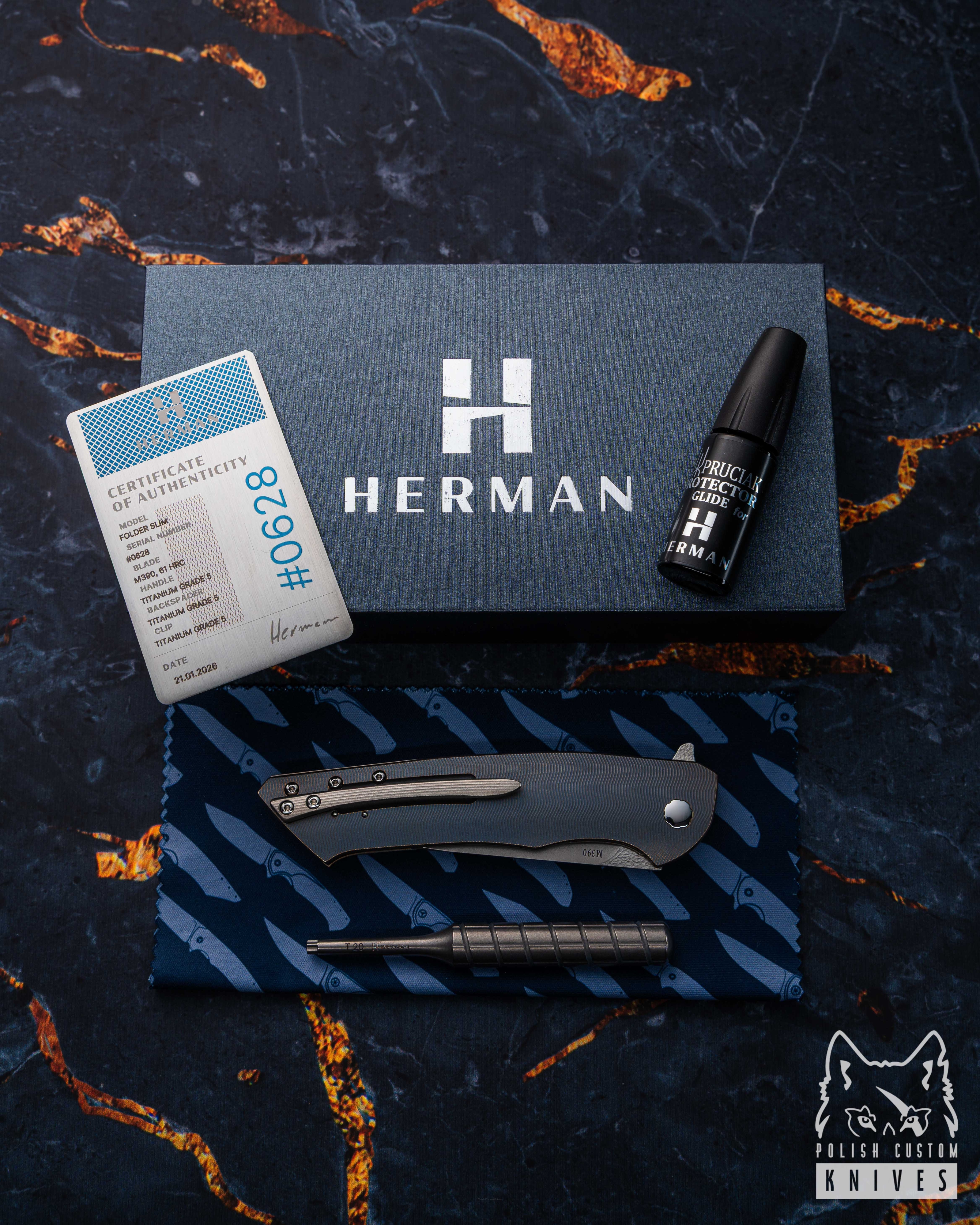 New original box including a microfiber cloth, Pruciak Protector Glide for Herman oil, and a dedicated titanium screwdriver manufactured in-house by Herman Knives.