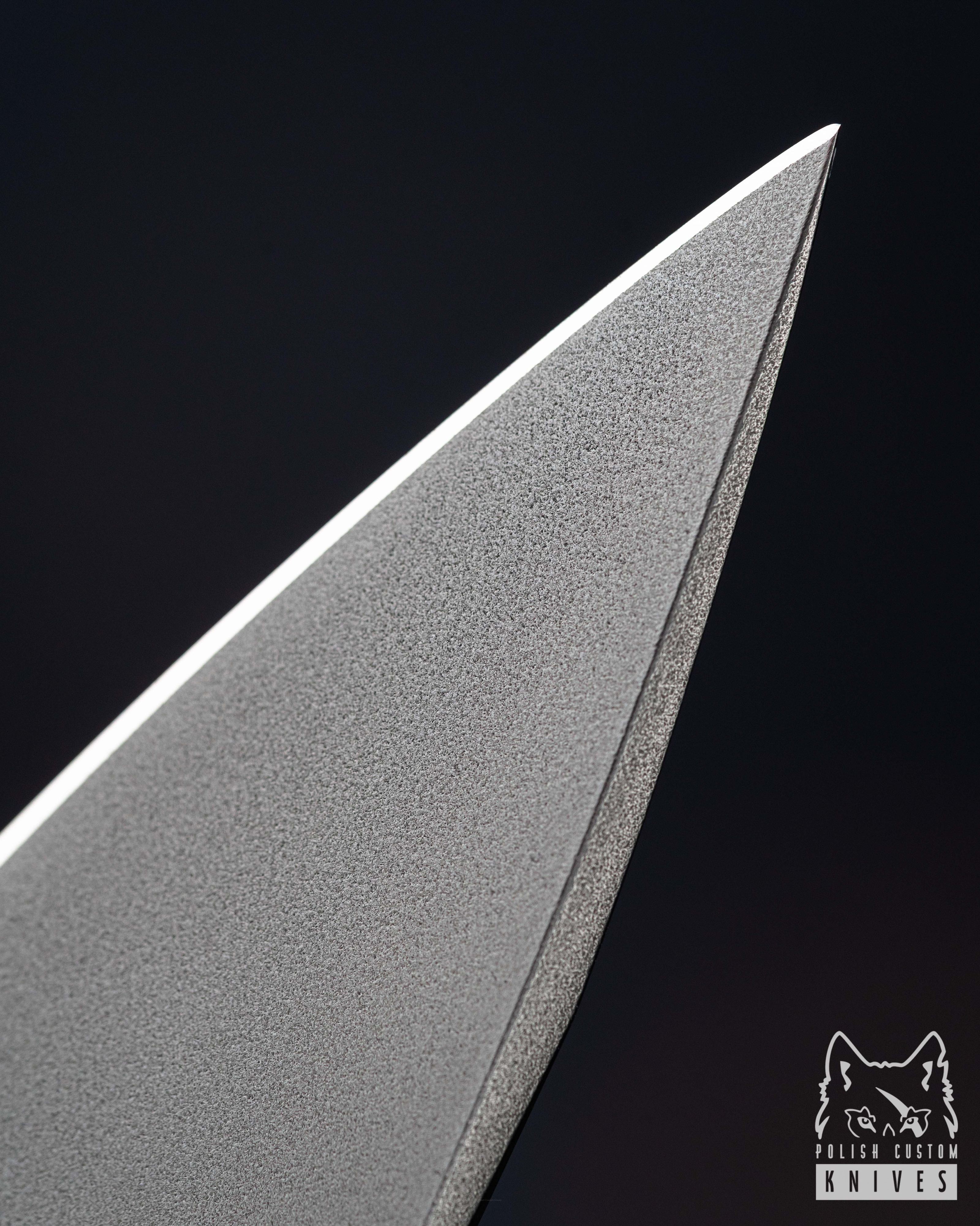 thickness 3,3 mm (0.1280"),, hardness 61 HRC, heat treated with a deep crio (liquid nitrogen), Medium detent, Flat grind