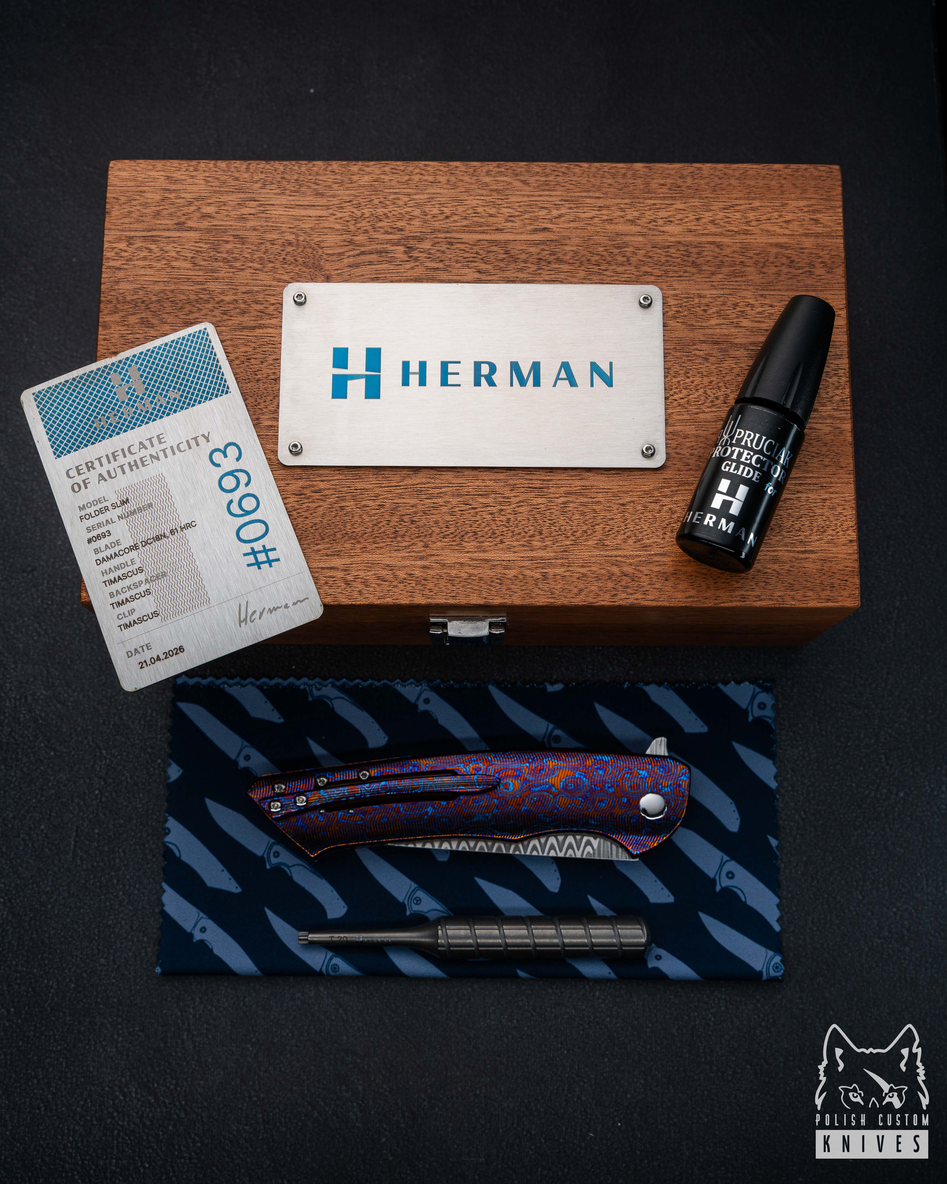 New original box including a microfiber cloth, Pruciak Protector Glide for Herman oil, and a dedicated titanium screwdriver manufactured in-house by Herman Knives.