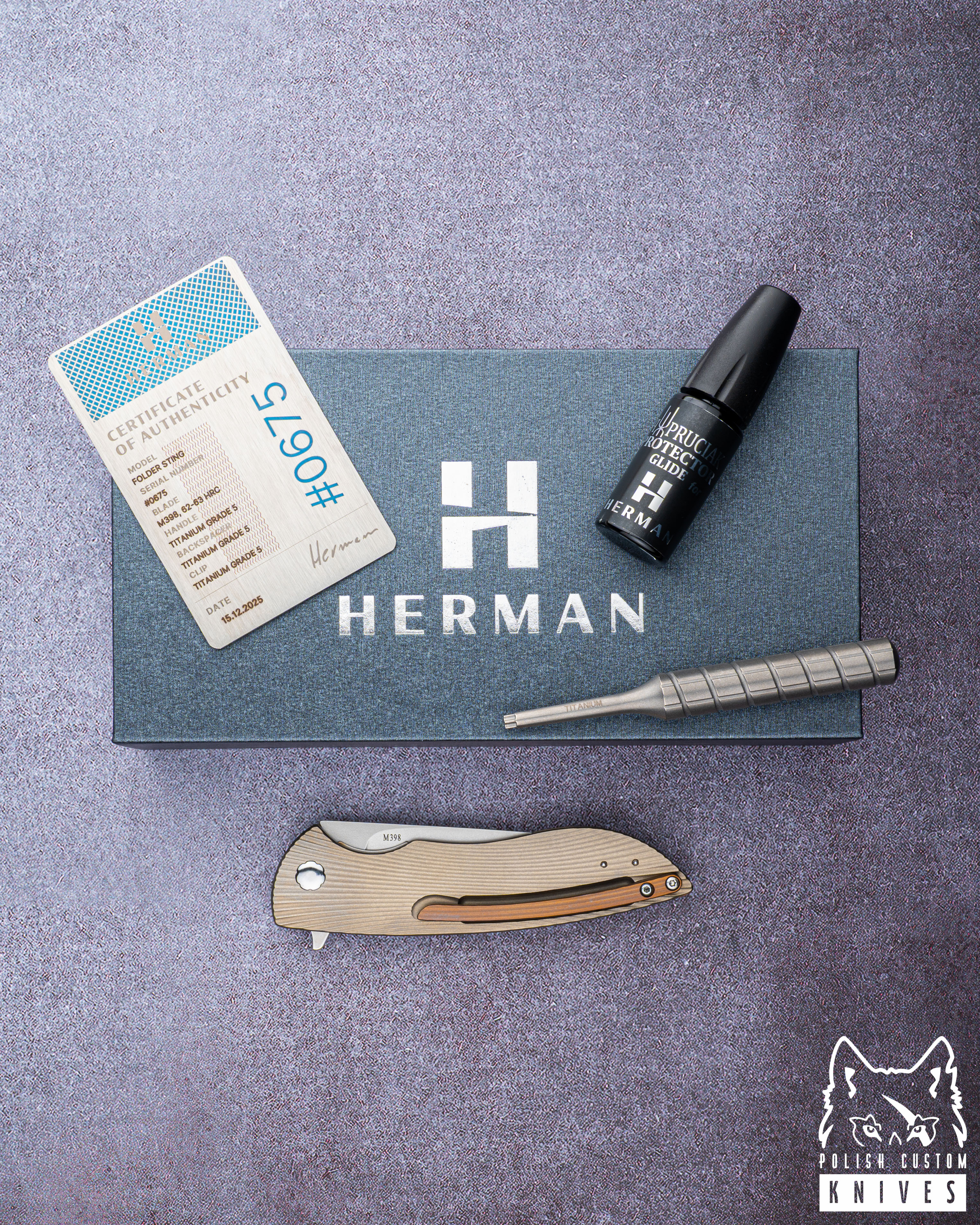 New original box including a microfiber cloth, Pruciak Protector Glide for Herman oil, and a dedicated titanium screwdriver manufactured in-house by Herman Knives.