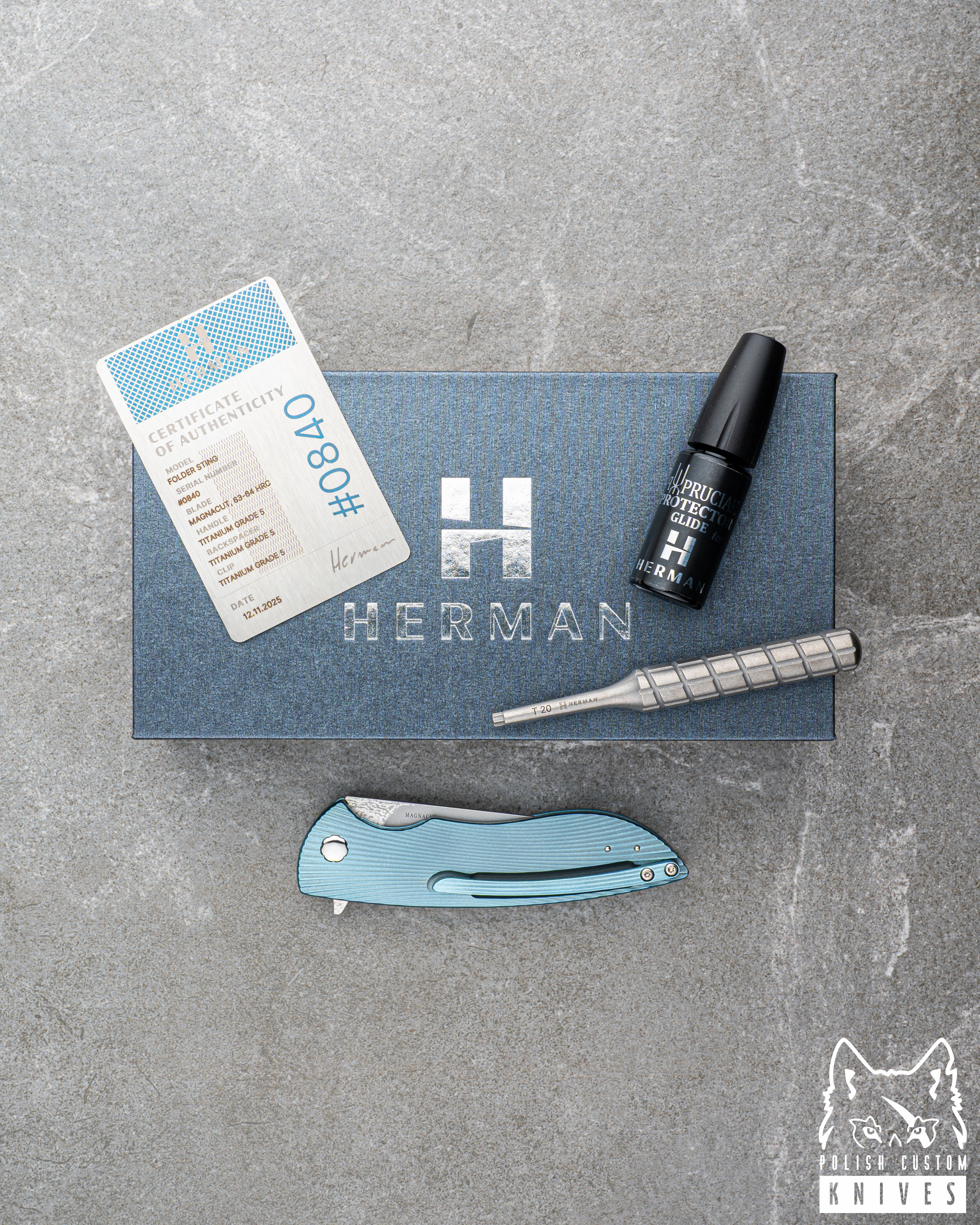 New original box including a microfiber cloth, Pruciak Protector Glide for Herman oil, and a dedicated titanium screwdriver manufactured in-house by Herman Knives.