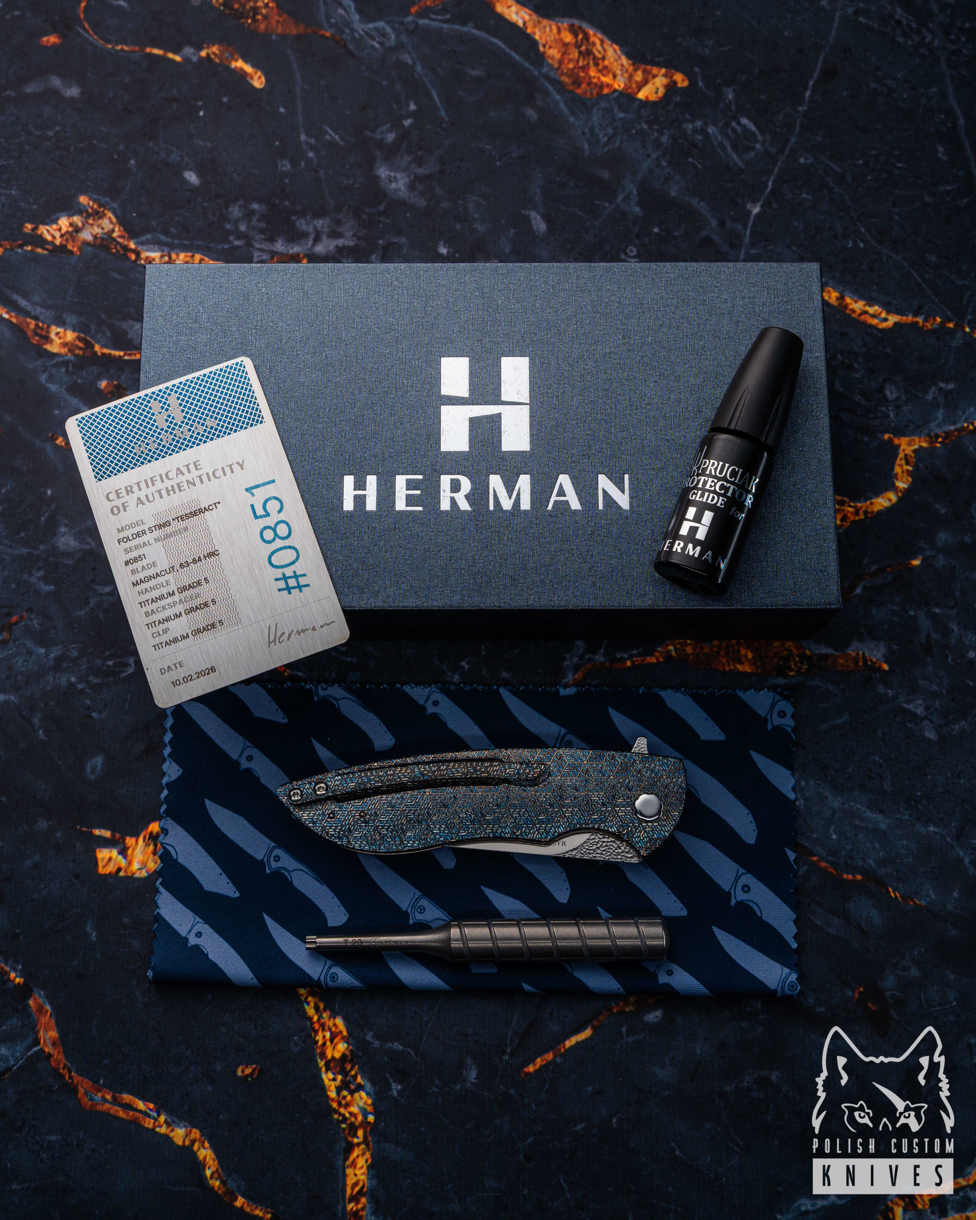 New original box including a microfiber cloth, Pruciak Protector Glide for Herman oil, and a dedicated titanium screwdriver manufactured in-house by Herman Knives.