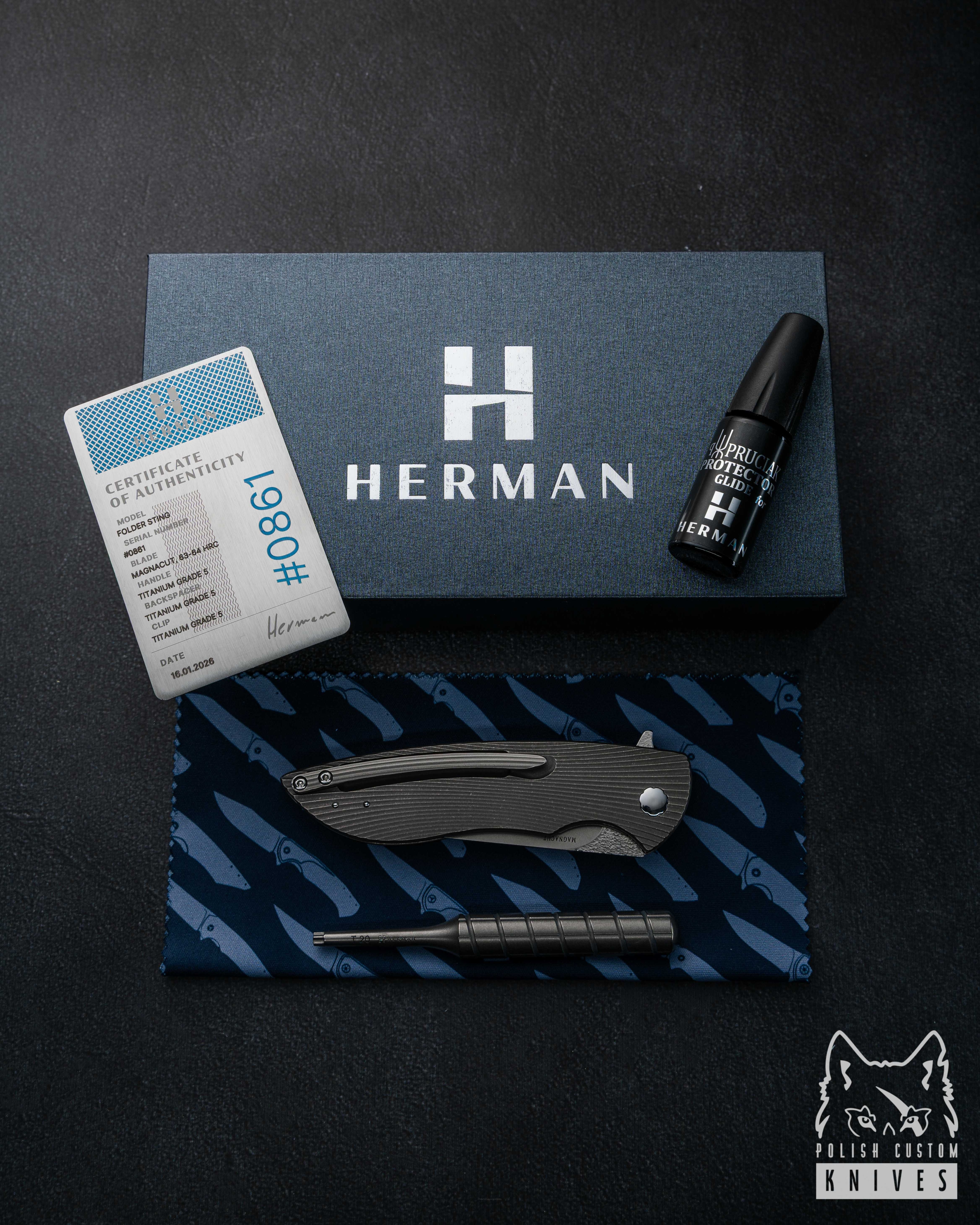 New original box including a microfiber cloth, Pruciak Protector Glide for Herman oil, and a dedicated titanium screwdriver manufactured in-house by Herman Knives.