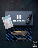 New original box including a microfiber cloth, Pruciak Protector Glide for Herman oil, and a dedicated titanium screwdriver manufactured in-house by Herman Knives.