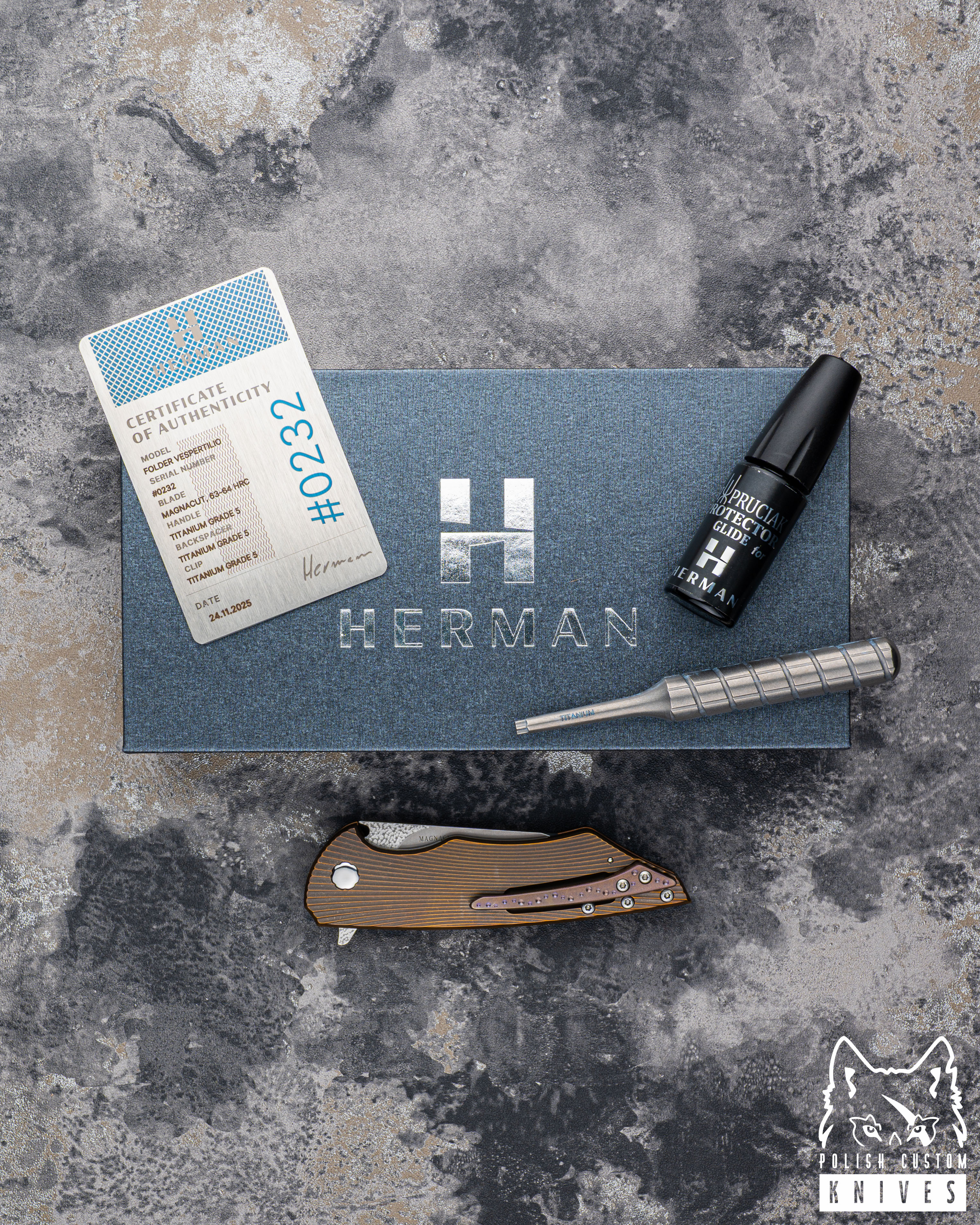 New original wooden box including a microfiber cloth, Pruciak Protector Glide for Herman oil, and a dedicated titanium screwdriver manufactured in-house by Herman Knives.