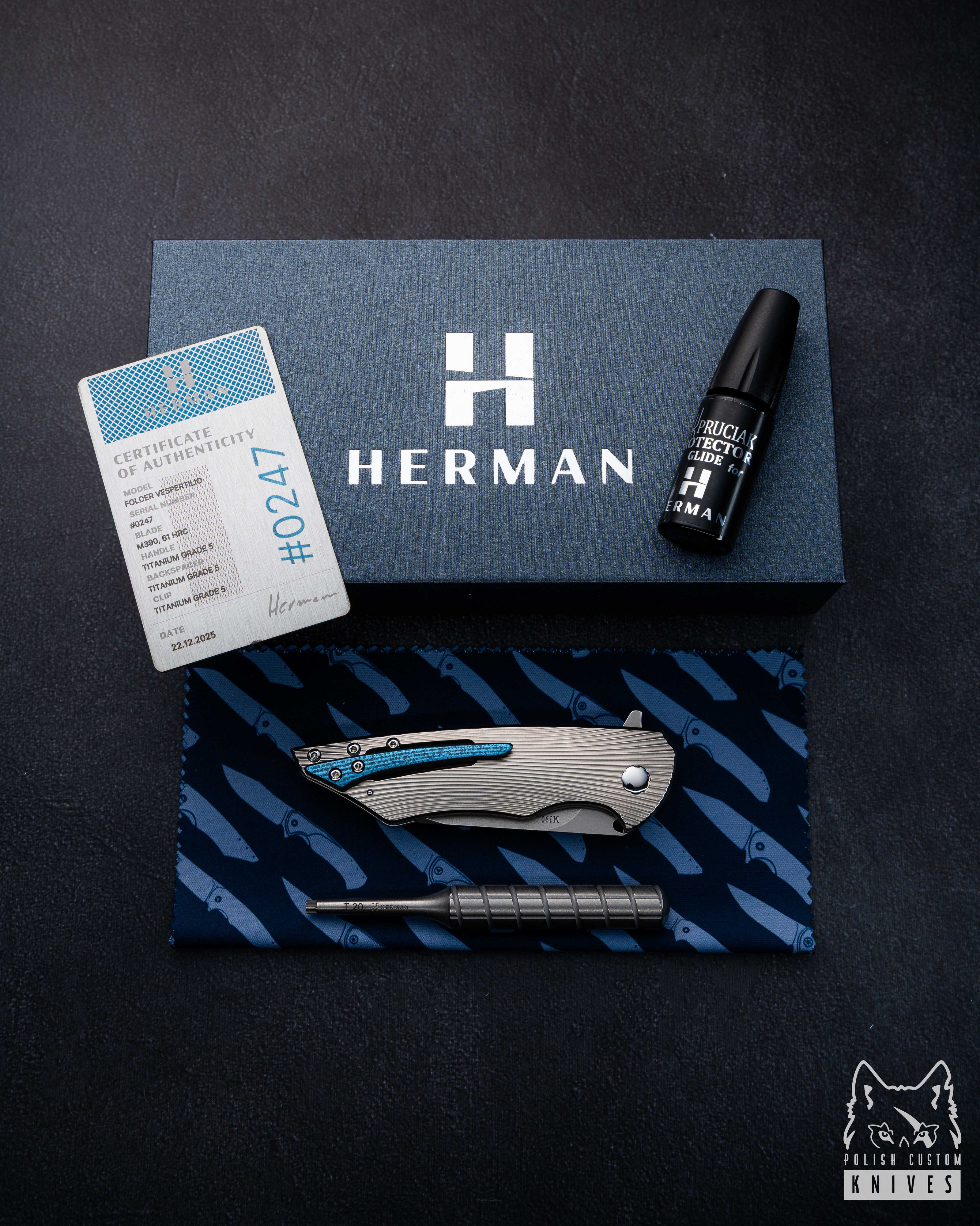 New original wooden box including a microfiber cloth, Pruciak Protector Glide for Herman oil, and a dedicated titanium screwdriver manufactured in-house by Herman Knives.