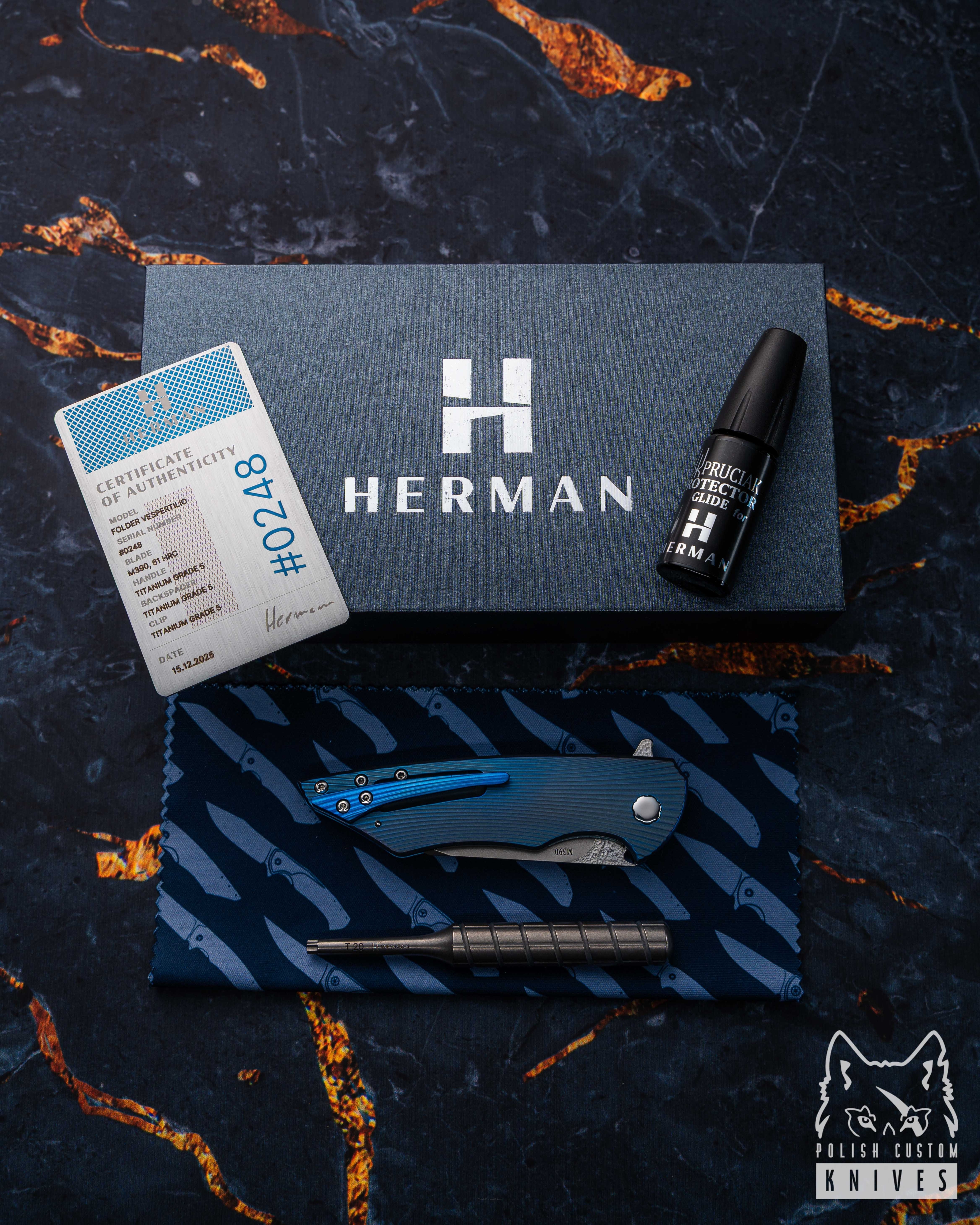 New original wooden box including a microfiber cloth, Pruciak Protector Glide for Herman oil, and a dedicated titanium screwdriver manufactured in-house by Herman Knives.