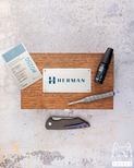 New original box including a microfiber cloth, Pruciak Protector Glide for Herman oil, and a dedicated titanium screwdriver manufactured in-house by Herman Knives.