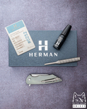 New original box including a microfiber cloth, Pruciak Protector Glide for Herman oil, and a dedicated titanium screwdriver manufactured in-house by Herman Knives.