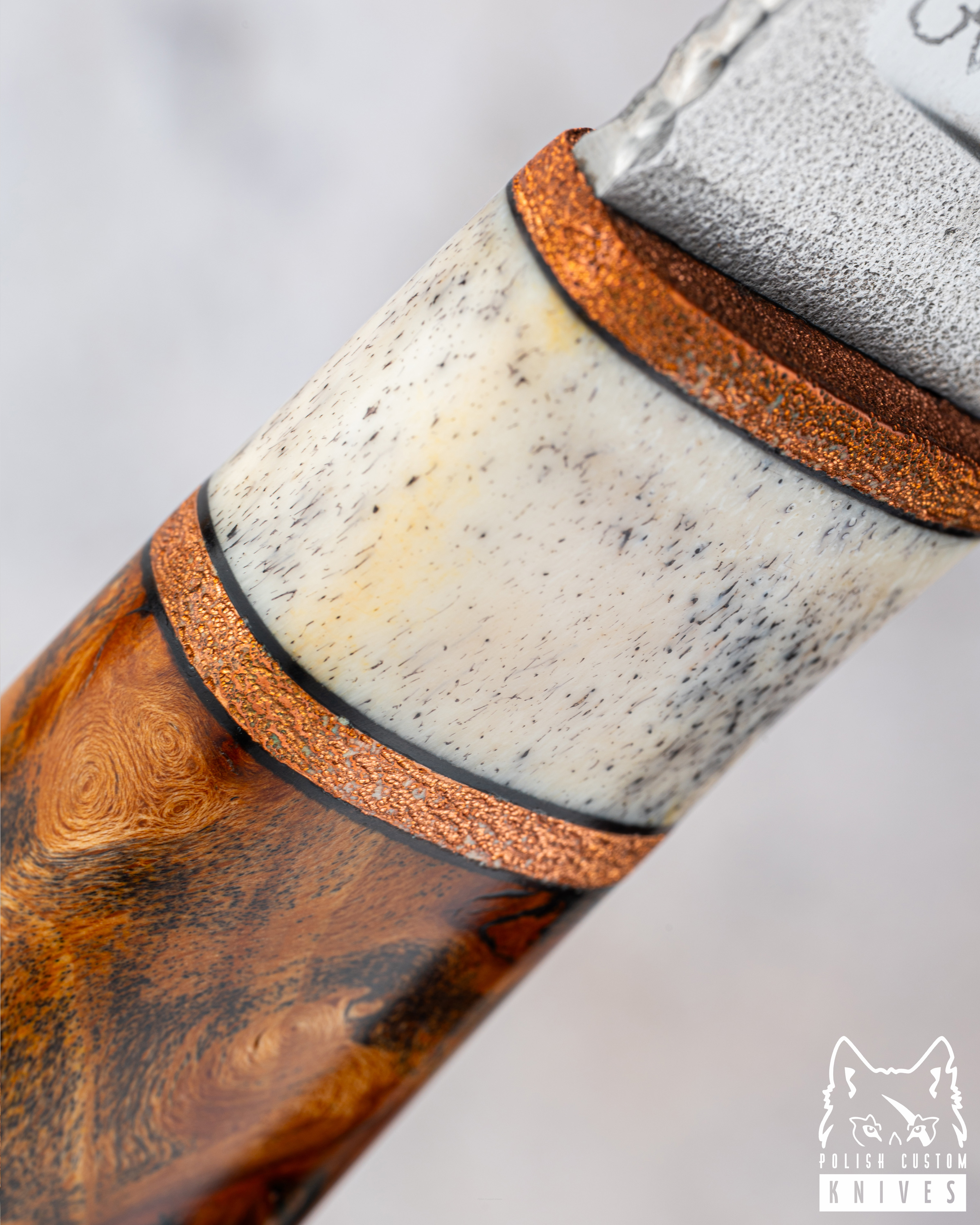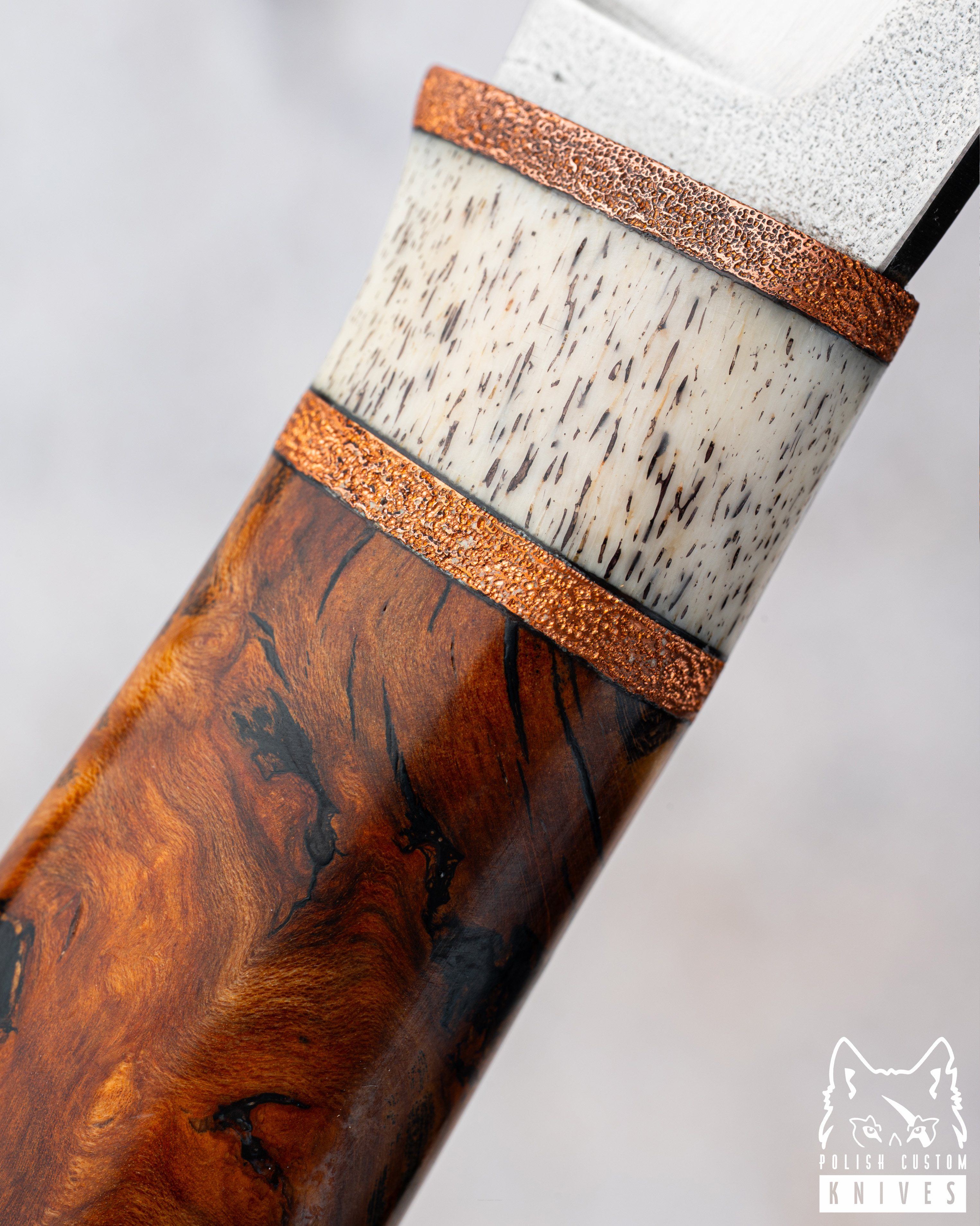 Handle: Copper, deer antler core, beech burl