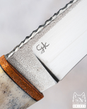 Handcrafted set of two hunting knives – one for gutting and one for skinning – designed for precise field work. The blades, made of Böhler K110 (D2) steel and hardened to 61–62 HRC, provide excellent sharpness, wear resistance, and reliability in all conditions. The handles, combining copper, deer antler core, and stabilized beech burl, offer a unique appearance, comfortable grip, and confident handling. A hand-stitched leather sheath completes the set, highlighting its distinctive character. An ideal choice for hunters who appreciate tradition, aesthetics, and top-class functionality.