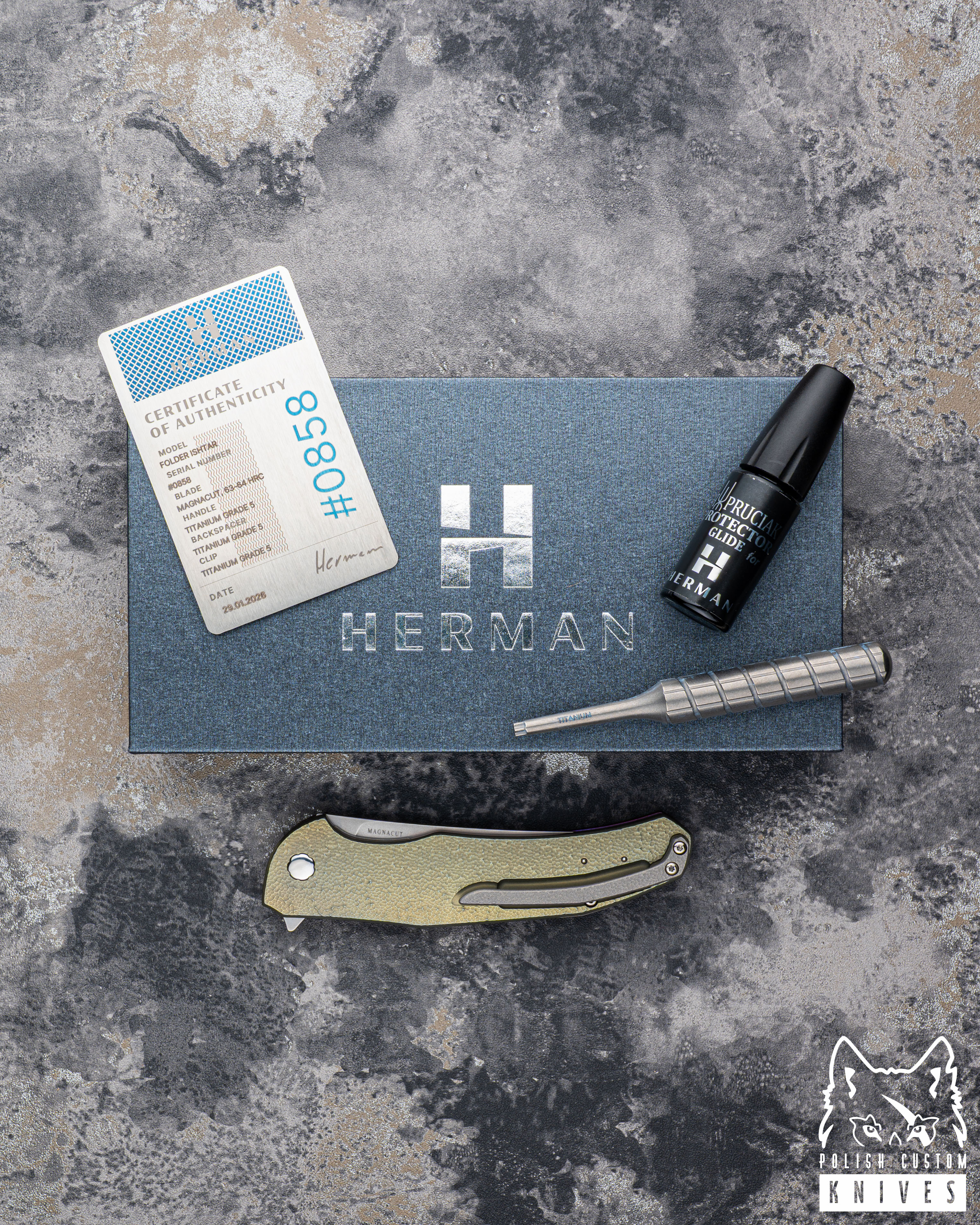 New original box including a microfiber cloth, Pruciak Protector Glide for Herman oil, and a dedicated stainless steel screwdriver manufactured in-house by Herman Knives.