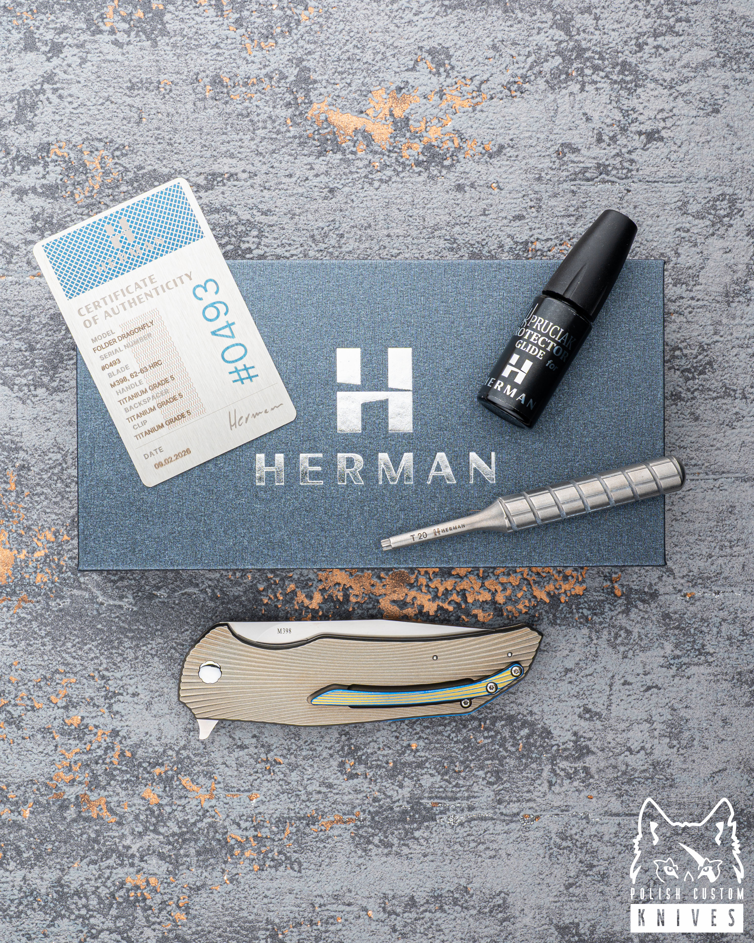 New original box including a microfiber cloth, Pruciak Protector Glide for Herman oil, and a dedicated titanium screwdriver manufactured in-house by Herman Knives.